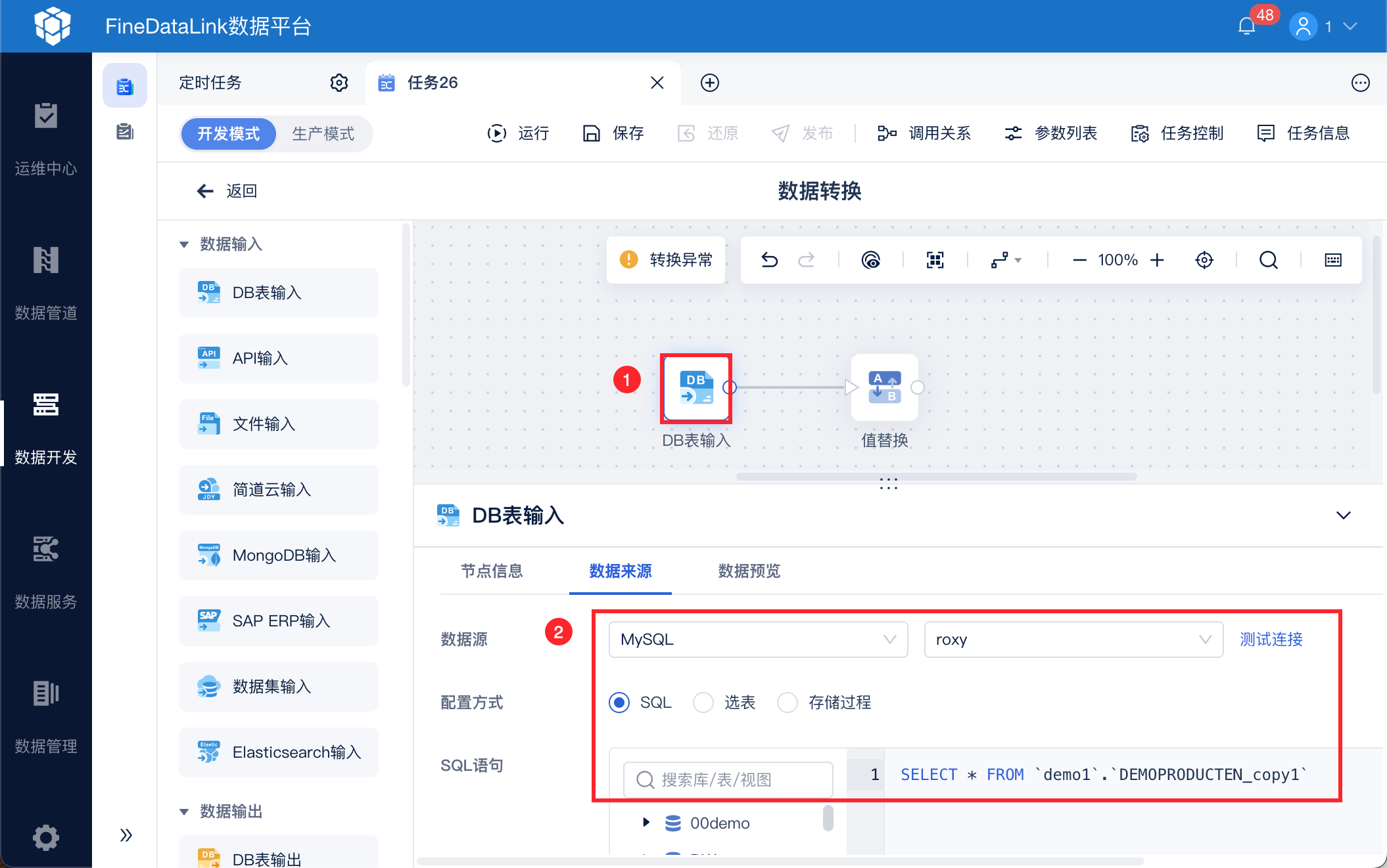 在数据开发中新建定时任务或者实时任务,进入任务编辑界面,使用数据转换功能,如下图所示: