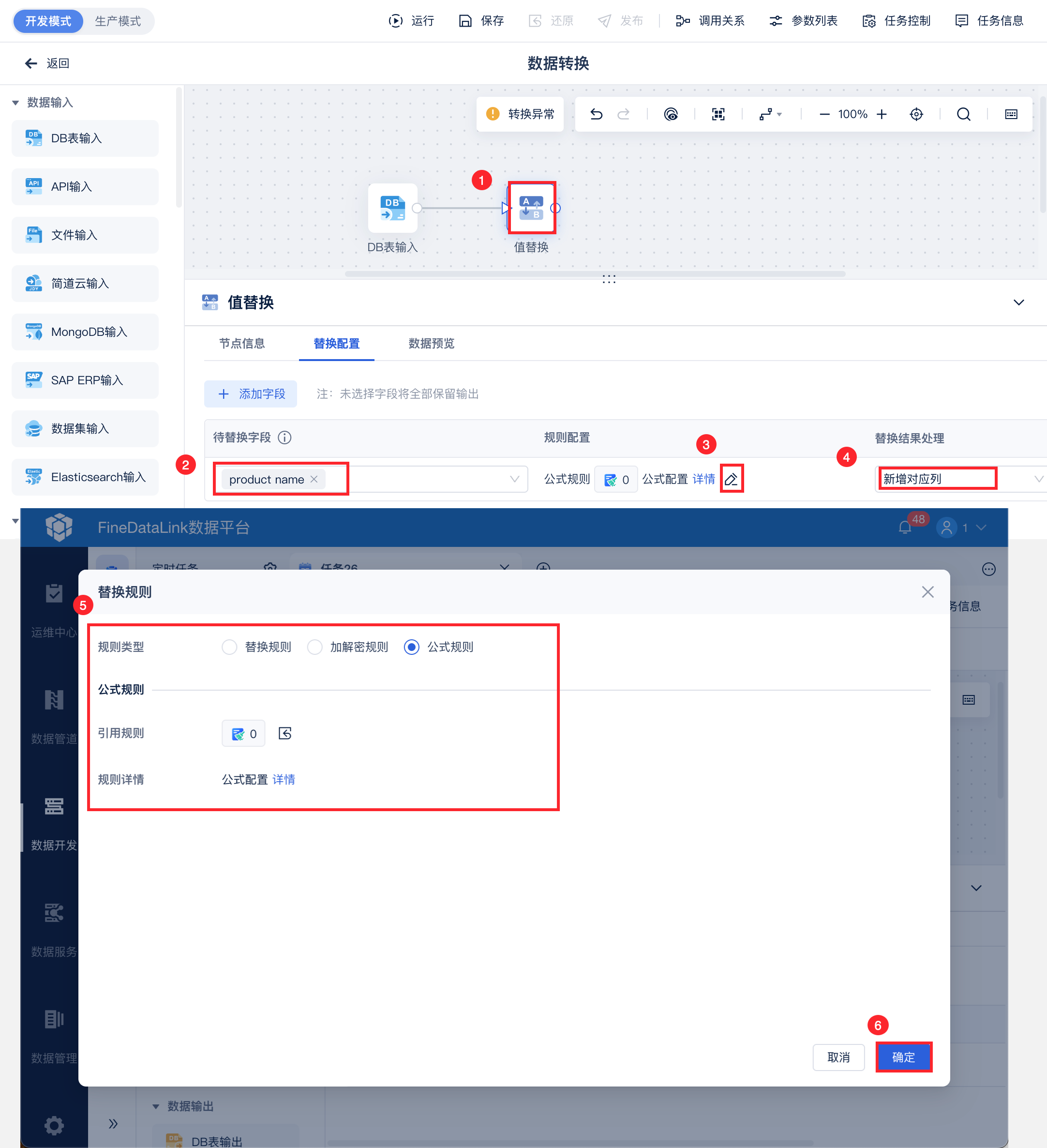 然后使用「值替换」算子,选择需要替换的字段,并设置规则为替换规则,引用全局清洗规则,将替换结果设置为新增一列,如下图所示: