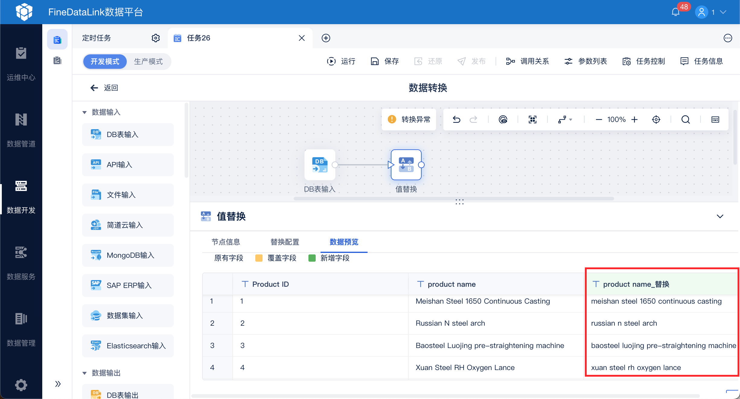替换后的数据即可进行数据输出或者后续处理,如下图所示: