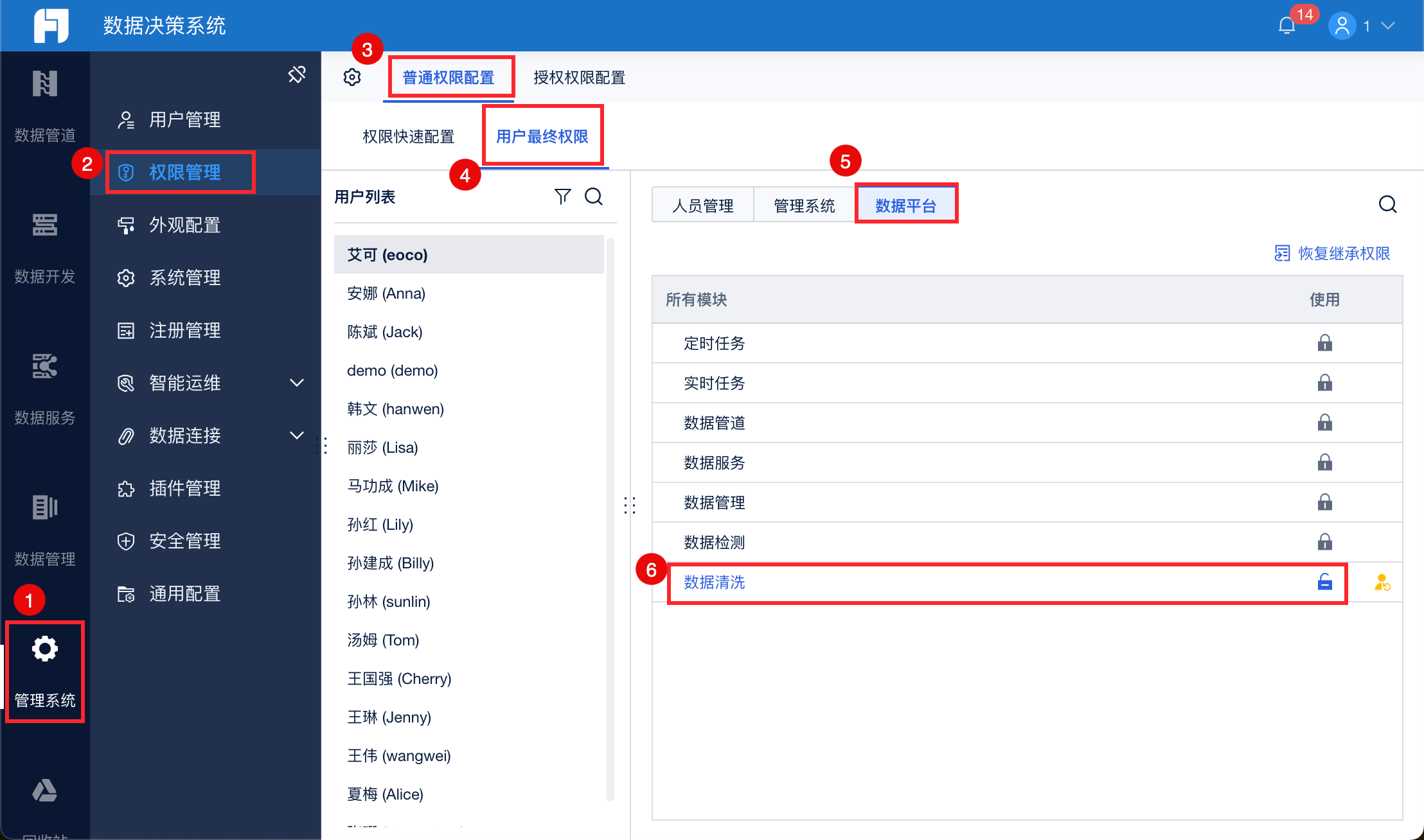 超级管理员登录 FDL,点击「管理系统>权限管理」,选择指定的用户或者部门/角色,开启「数据平台」下的「数据清洗」使用权限,如下图所示: