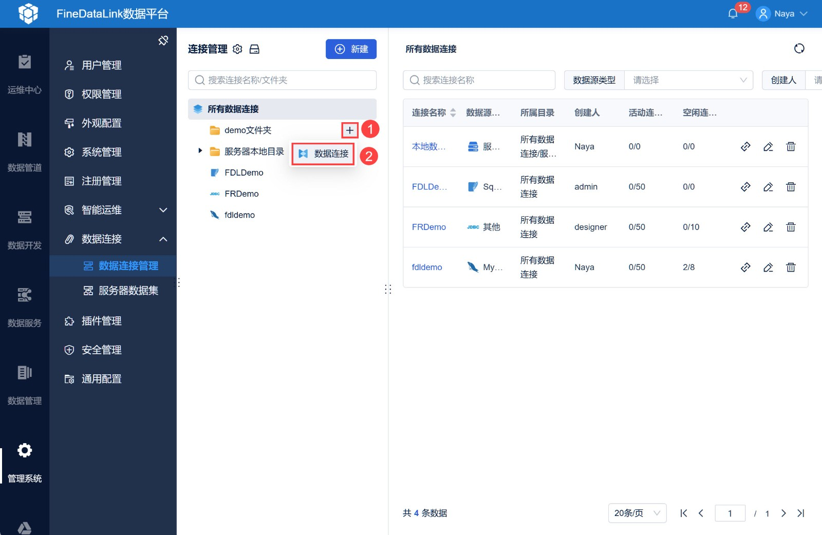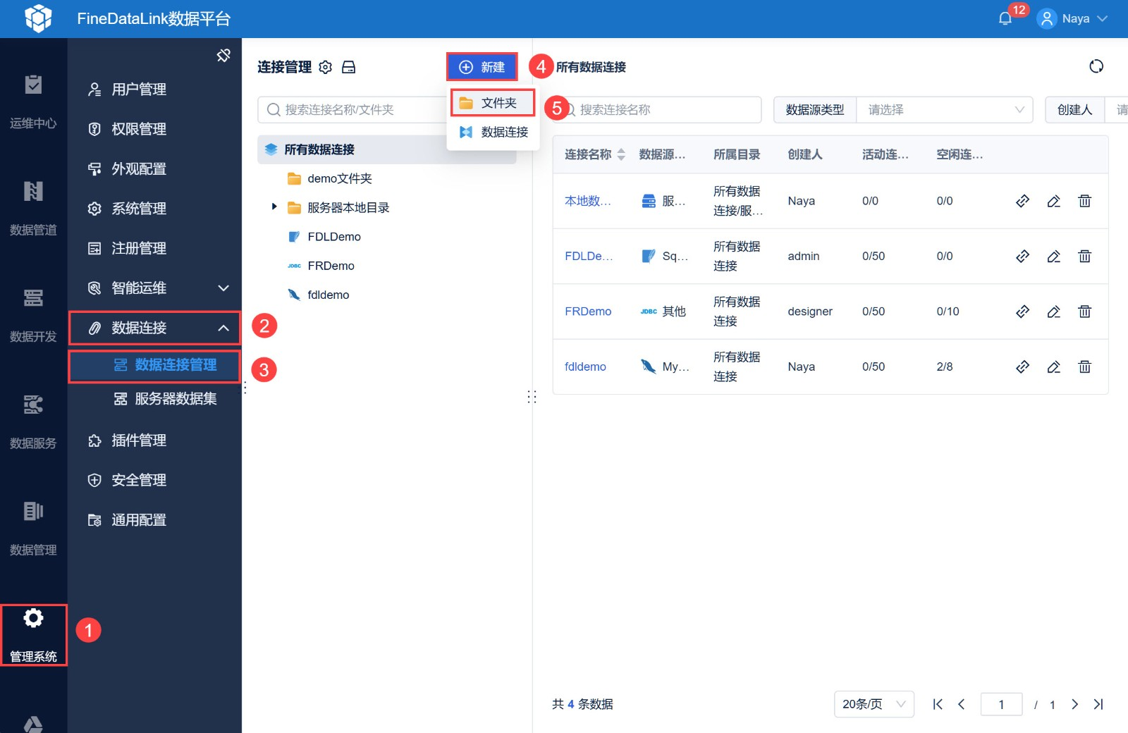 1)管理员进入 FDL 工程,点击「管理系统>数据连接管理」页面。点击「新建>文件夹」,可以使用文件夹对数据连接进行分类管理。如下图所示: