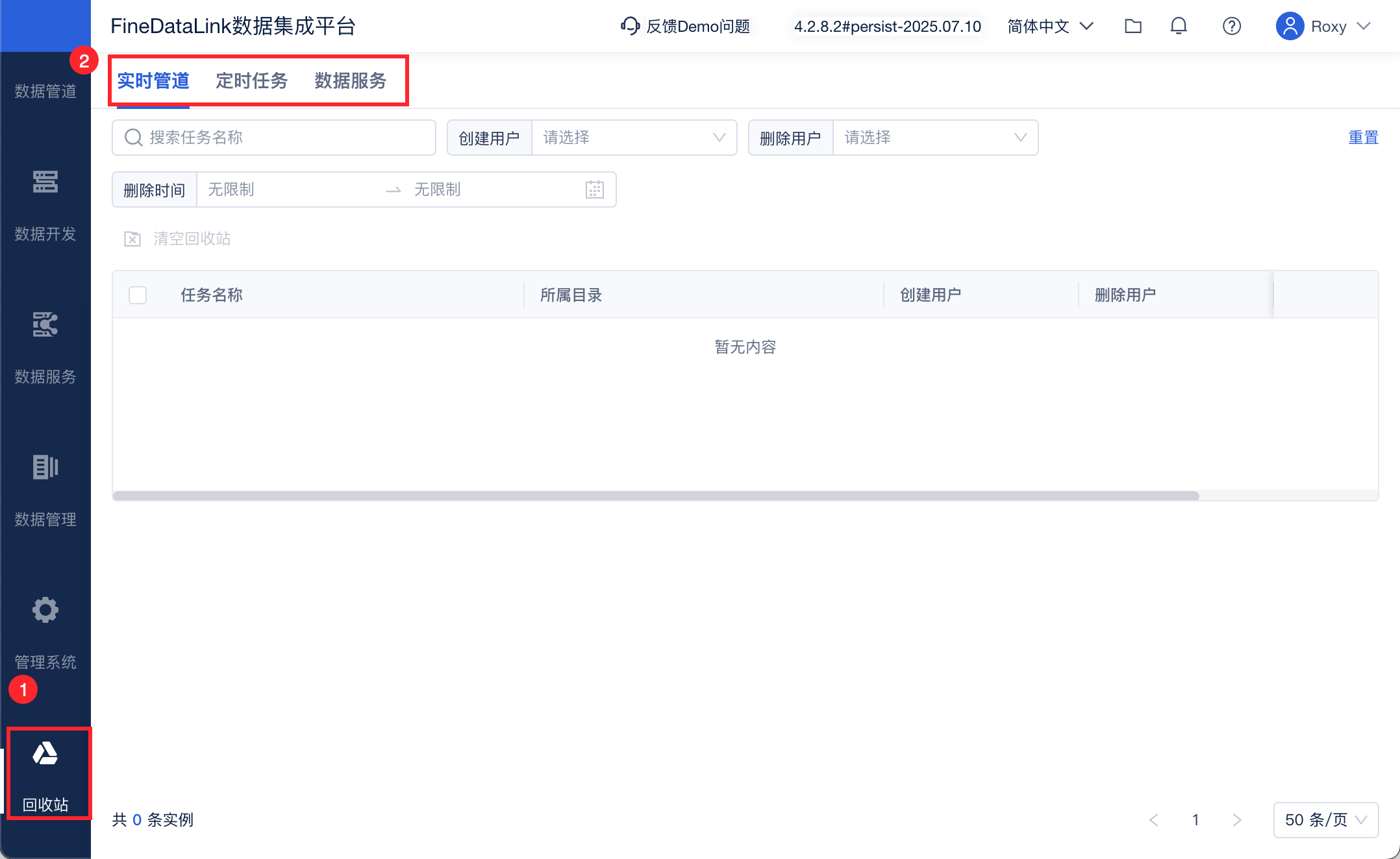 回收站支持对「数据开发>定时任务」、「数据管道」、「数据服务」中已经删除的任务进行资源还原、彻底删除等。