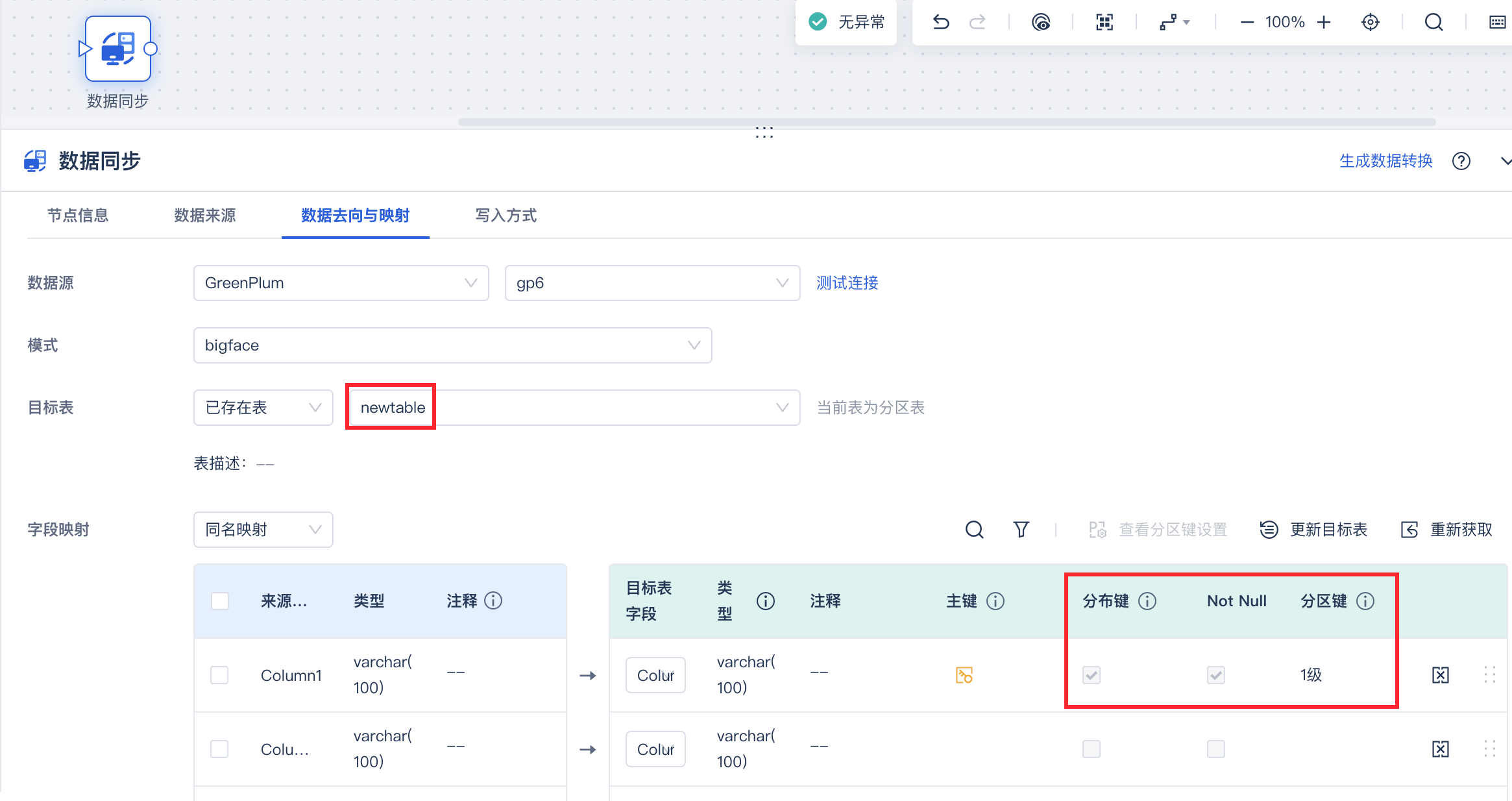 3)4.1.9.3 及之后的版本,管道任务自动建表支持指定分区键。如下图所示: