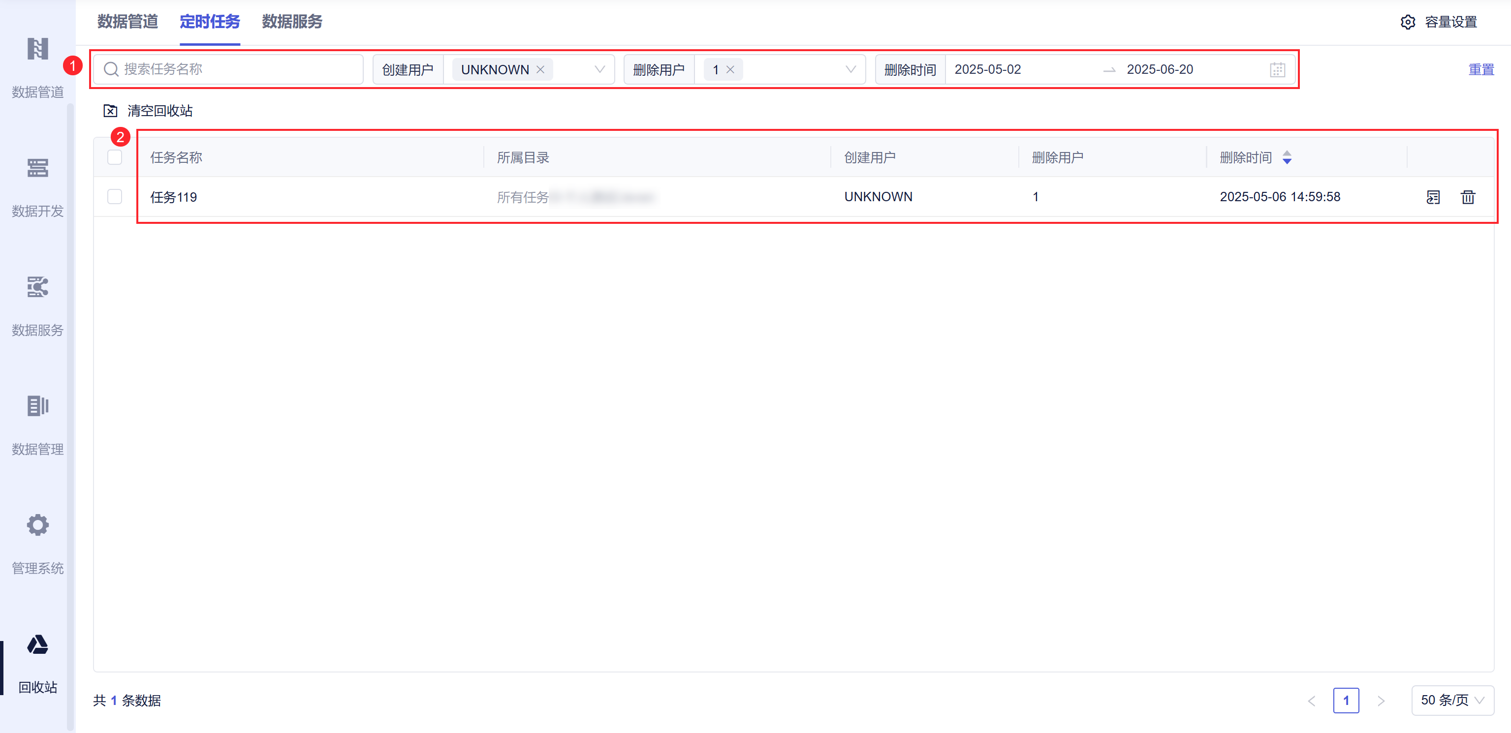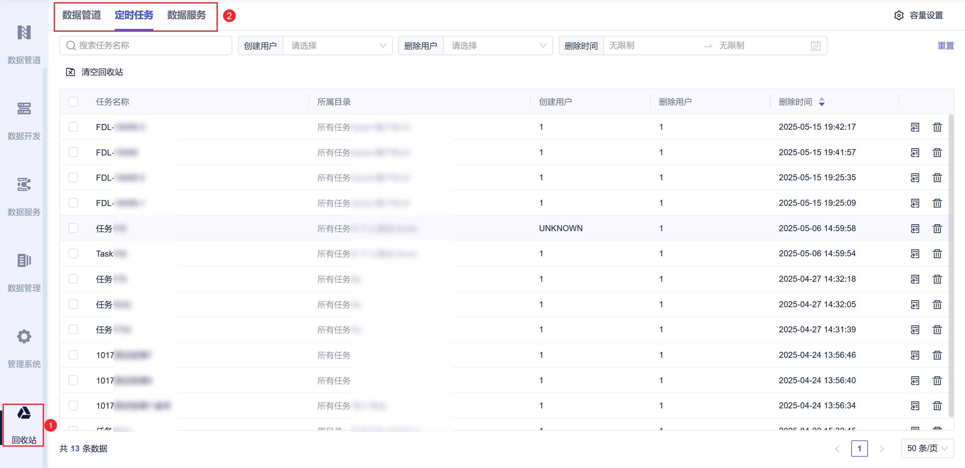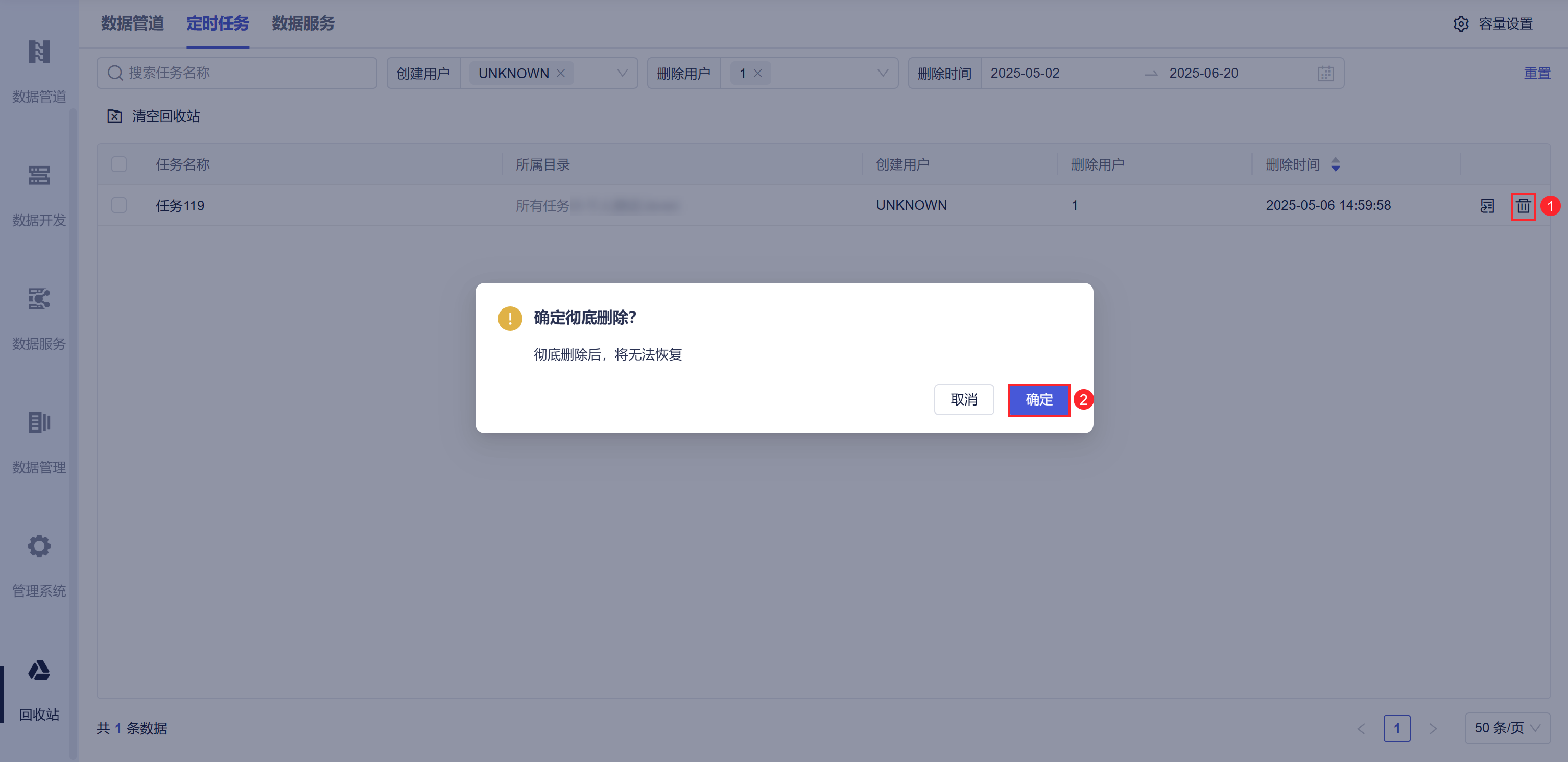 回收站支持对「数据管道」、「定时任务」、「数据服务」中已经删除的任务进行资源还原、彻底删除等。