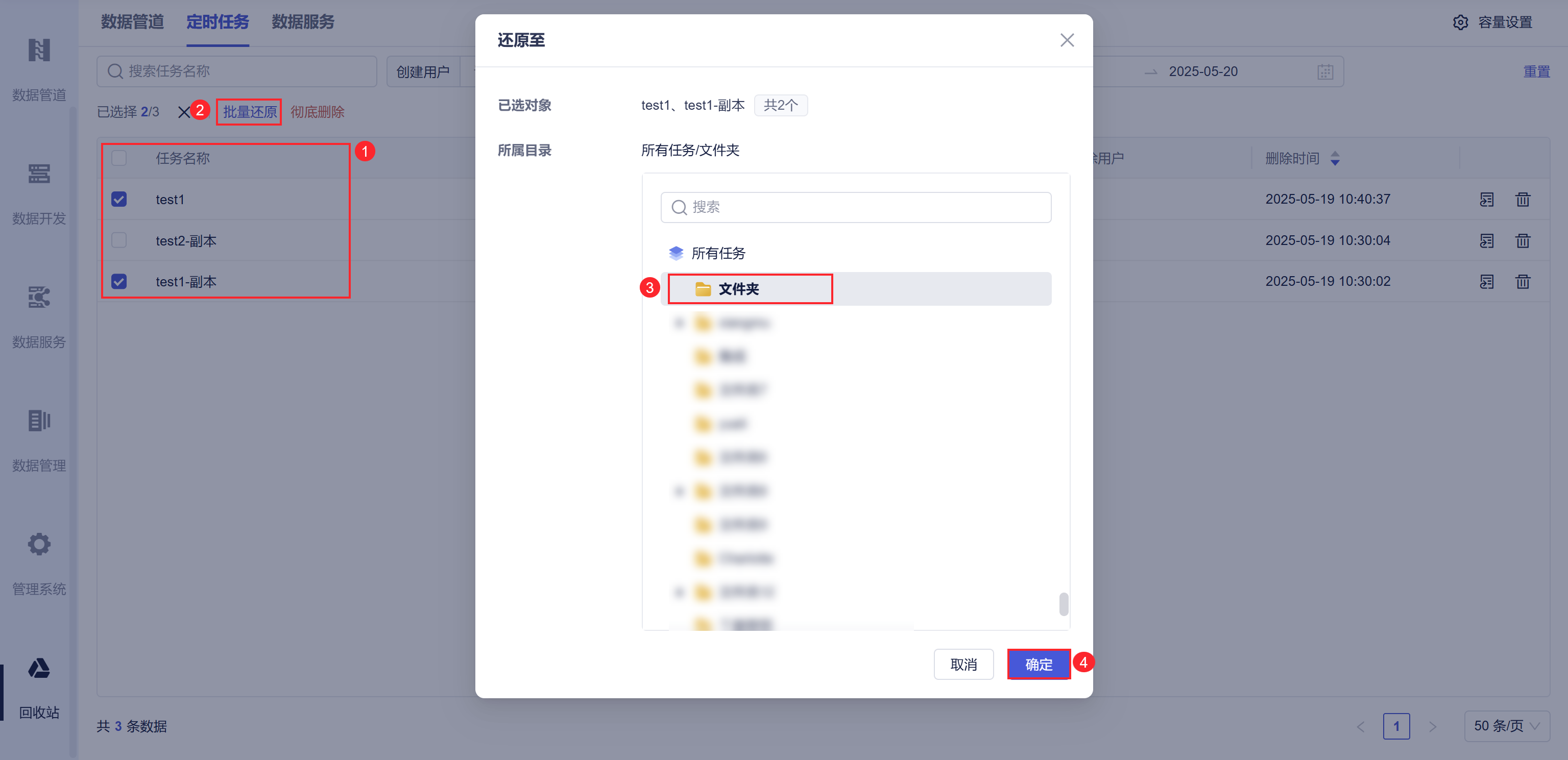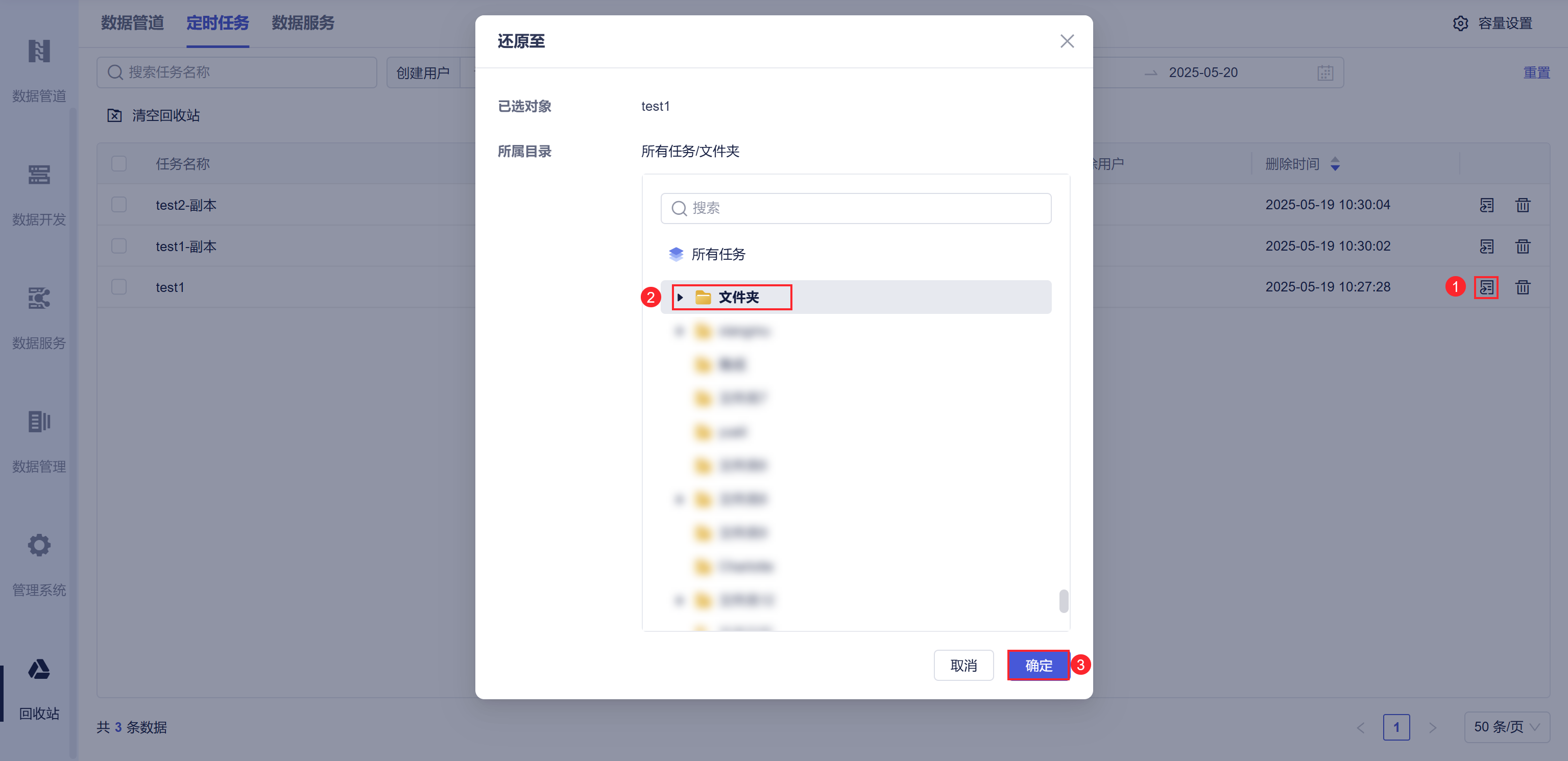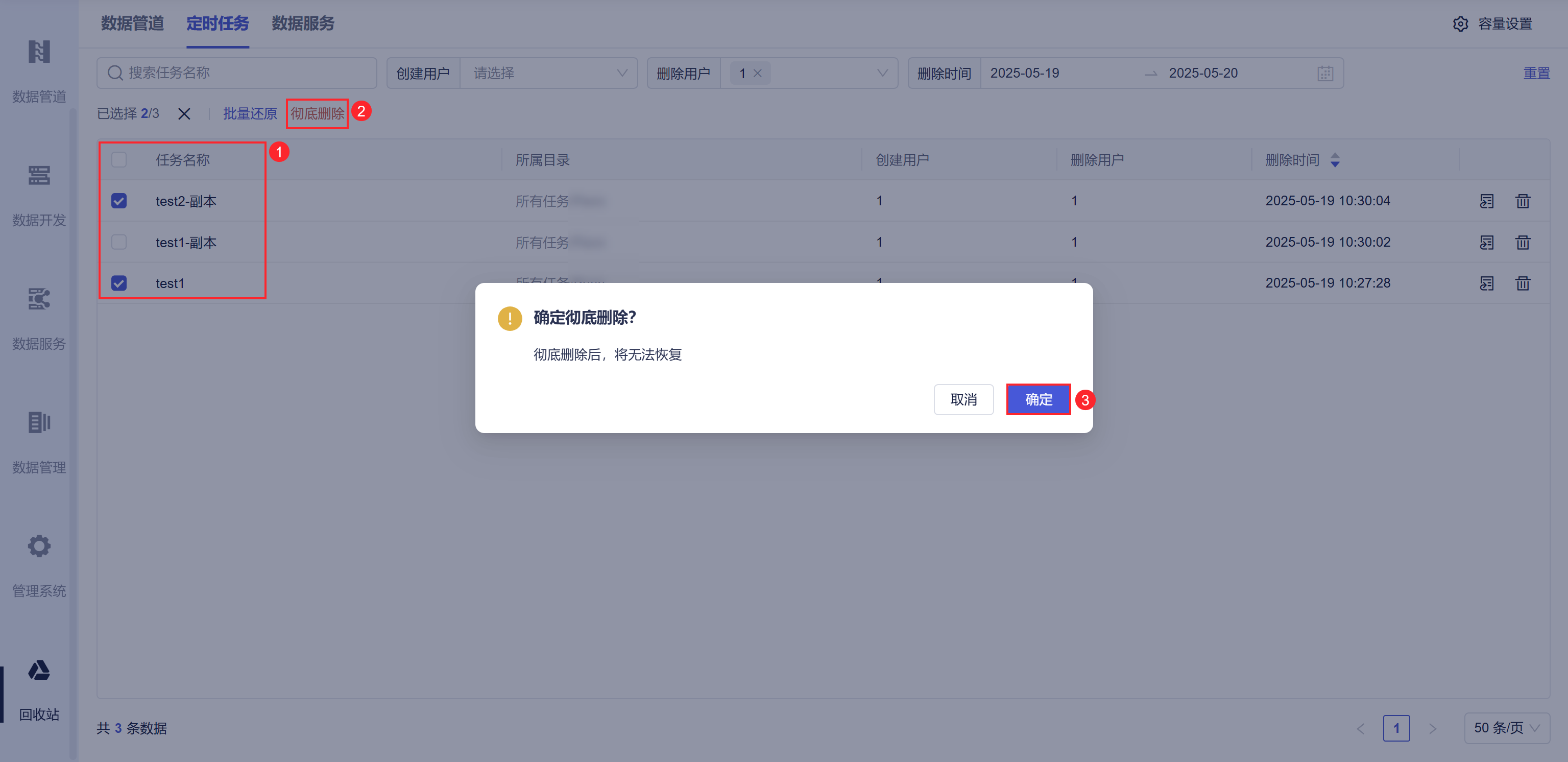 回收站支持对「数据管道」、「定时任务」、「数据服务」中已经删除的任务进行资源还原、彻底删除等。