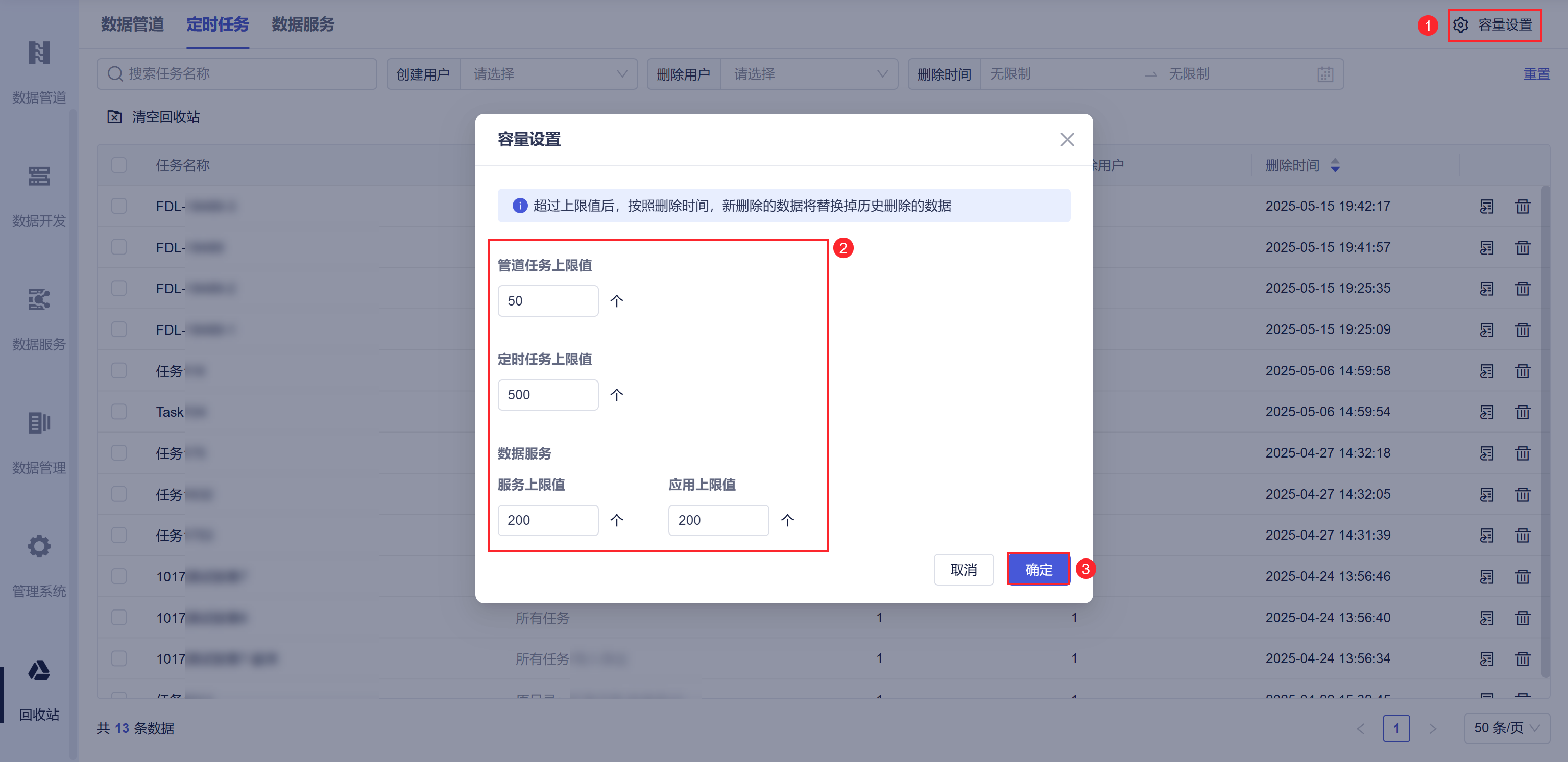 定时任务默认值为 500 个任务,最大限制 1000 个;管道任务默认值为 50 个任务,最大限制 100 个,API 和应用默认值为 200 个,最大限制 400 个。写入数据需要为正整数。