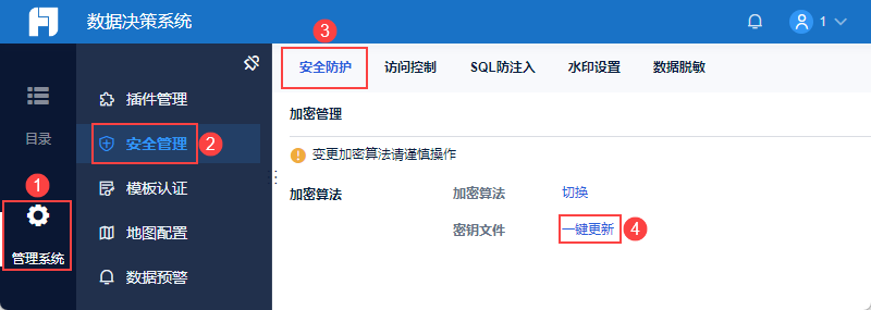 • 管理员登录帆软应用,点击「管理系统>安全管理>安全防护」,点击加密算法处的「一键更新」按钮。