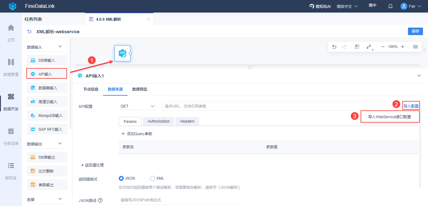将 API输入拖入画布中,由于是 Webservice 接口,因此可以点击导入,选择「导入Webservice 接口配置」,如下图所示: