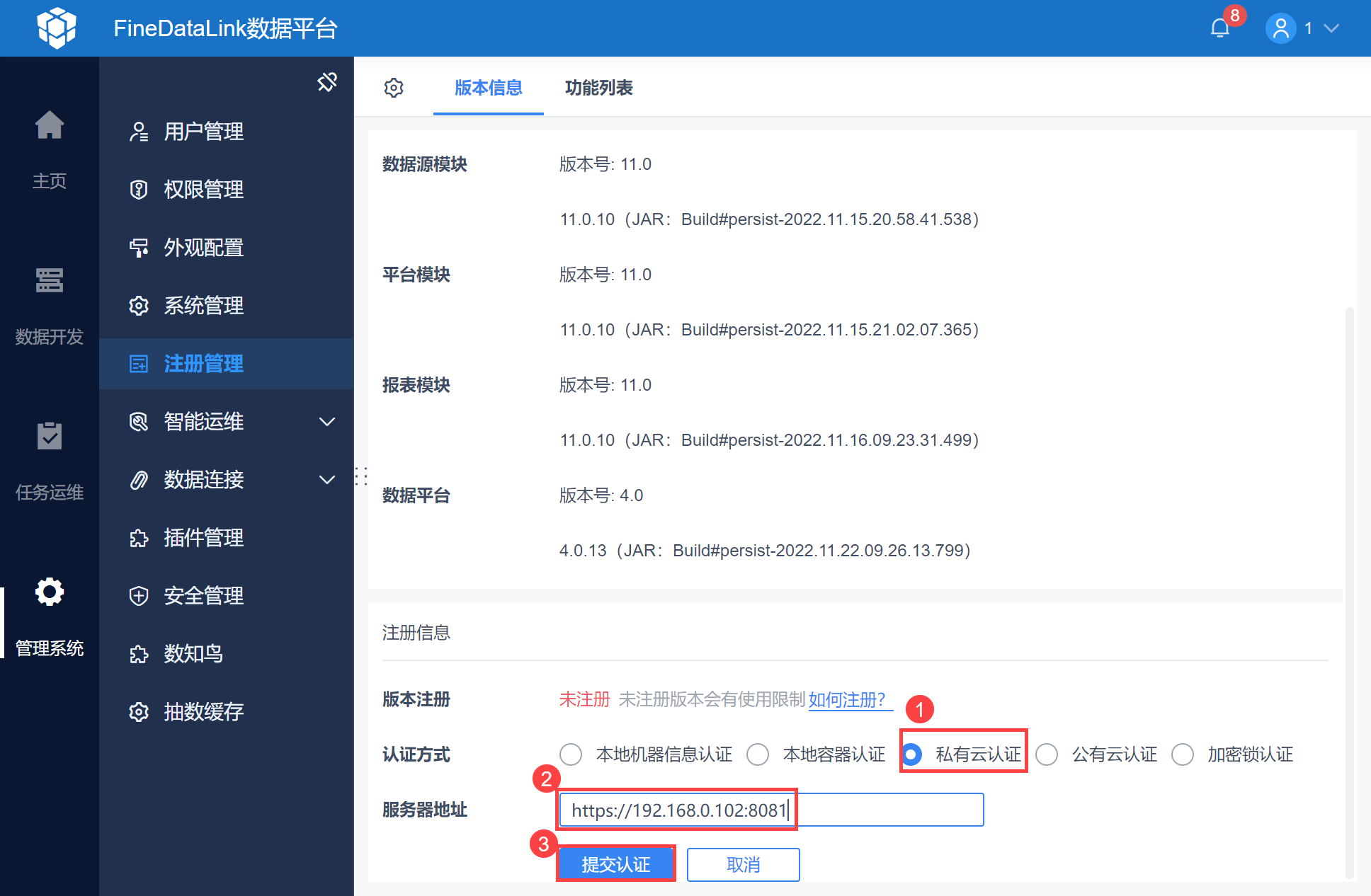 认证方式选择「私有云认证」,服务器地址填写上面授权服务器显示的 IP 和监听端口,例如https://172.16.63.131:8081,点击「提交认证」,如下图所示: