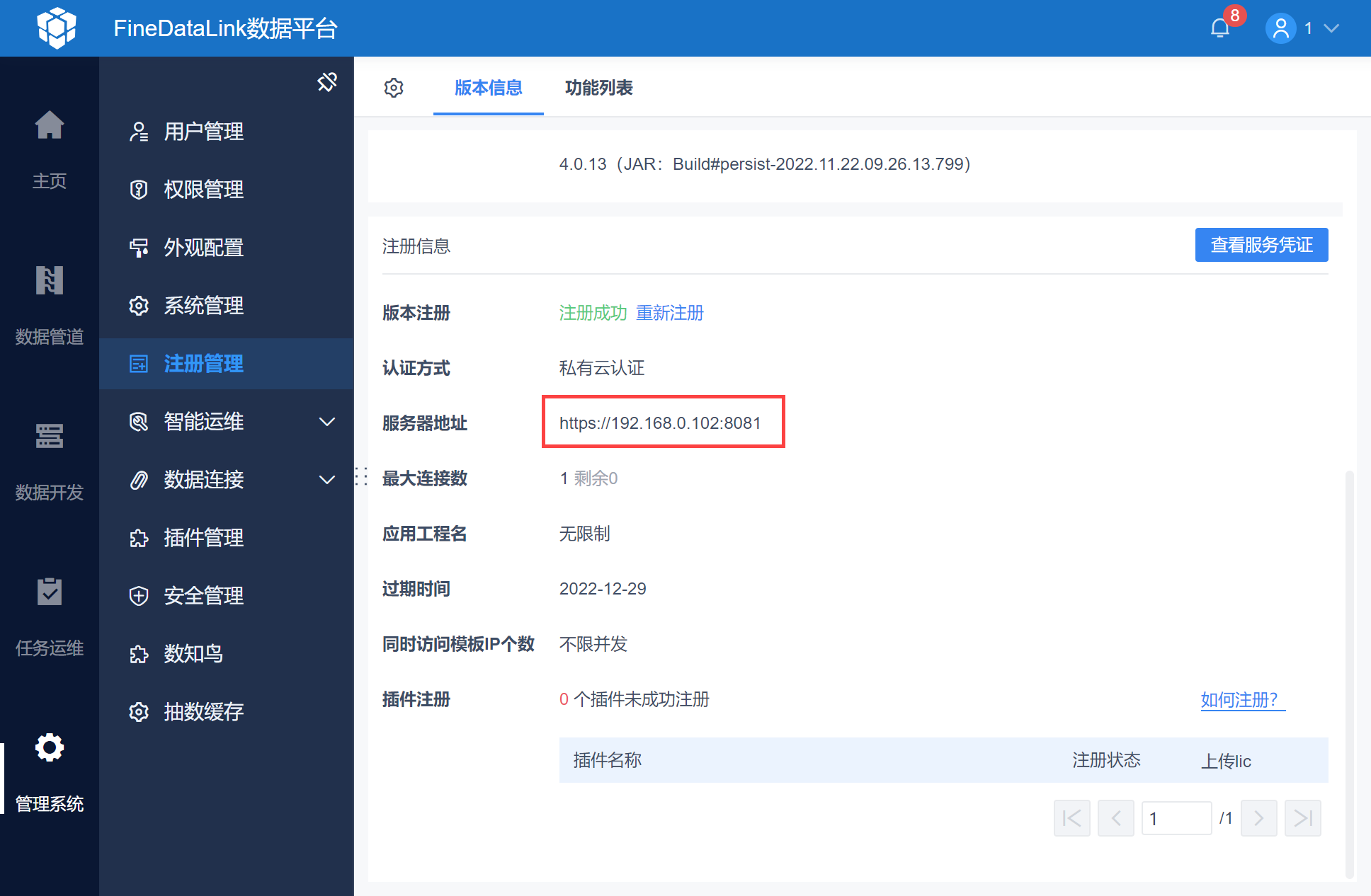 注:销毁授权服务器后,若重启FineDataLink则立即注册失败;若未重启FineDataLink则在约 24 小时后注册失败。