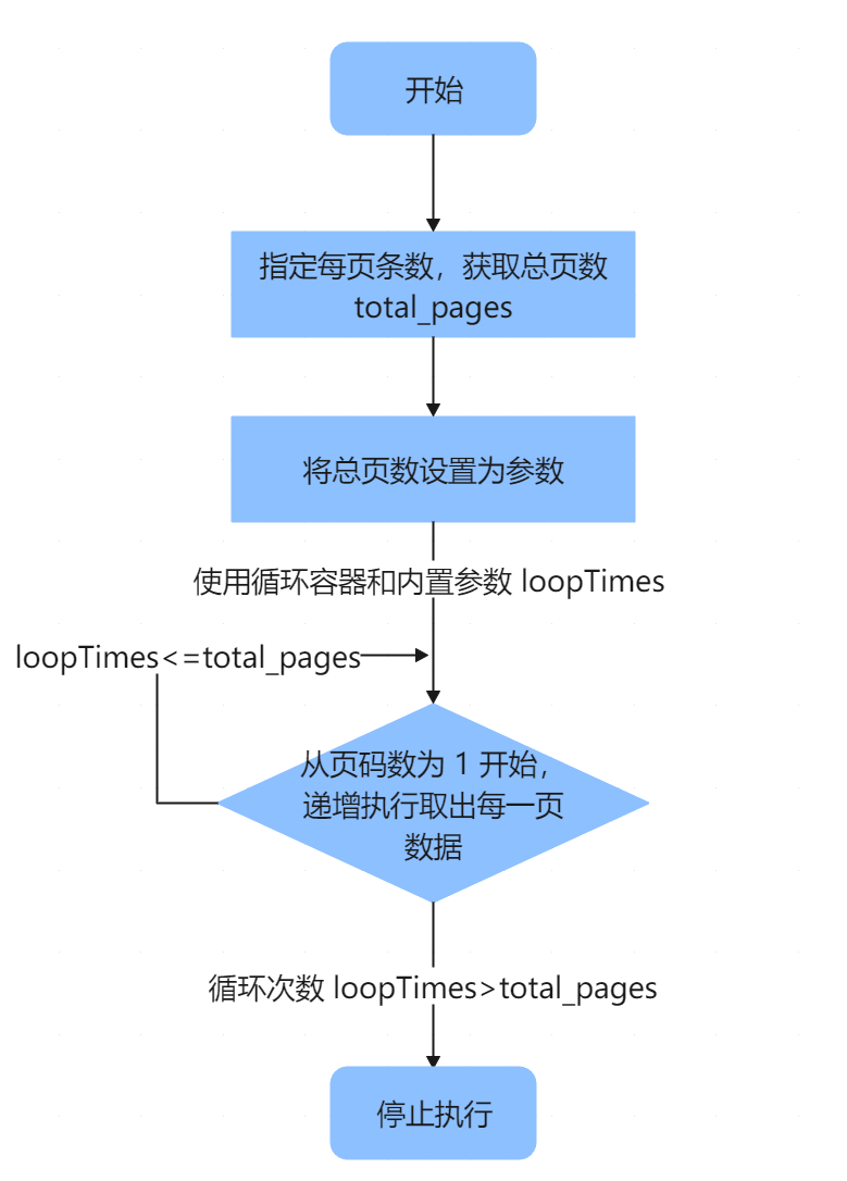 使用循环容器和内置参数 loopTimes,首次执行 pageIndex 页码数为 1 ,然后递增执行取出每一页的数据,当循环次数 loopTimes<=total_pages 继续执行,当循环次数 loopTimes>total_pages 时,停止执行。