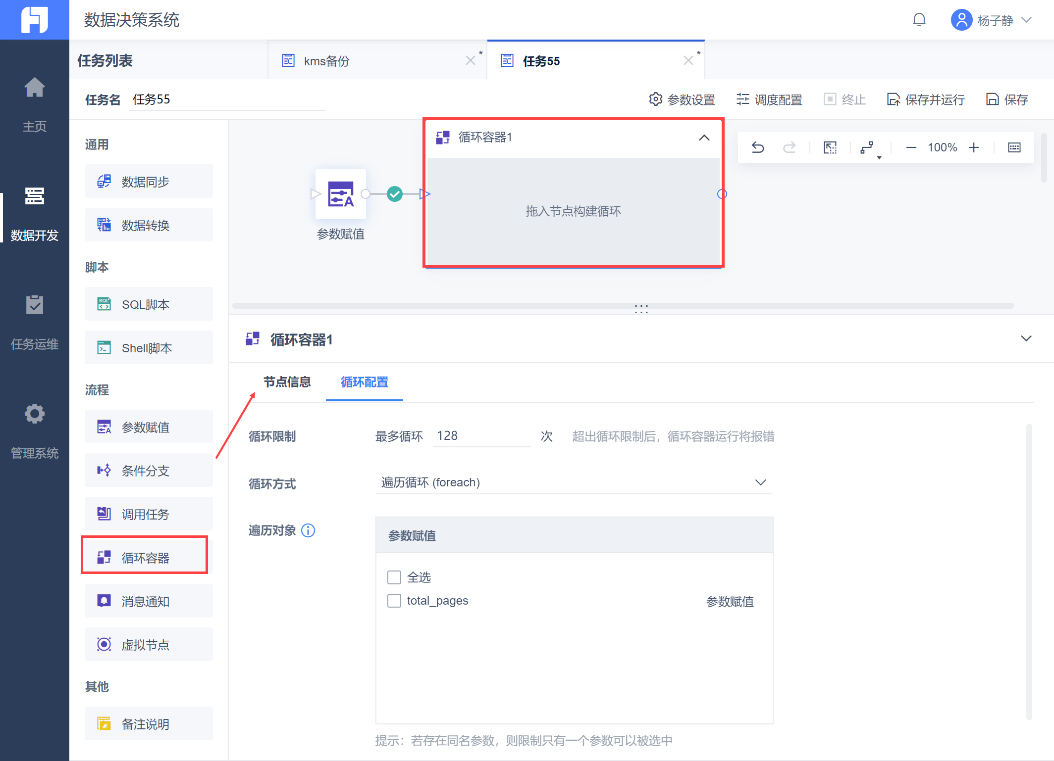 点击循环容器节点,设置循环次数,并设置循环方式为「条件循环」,点击配置条件为 loopTimes<=${total_pages},如下图所示: