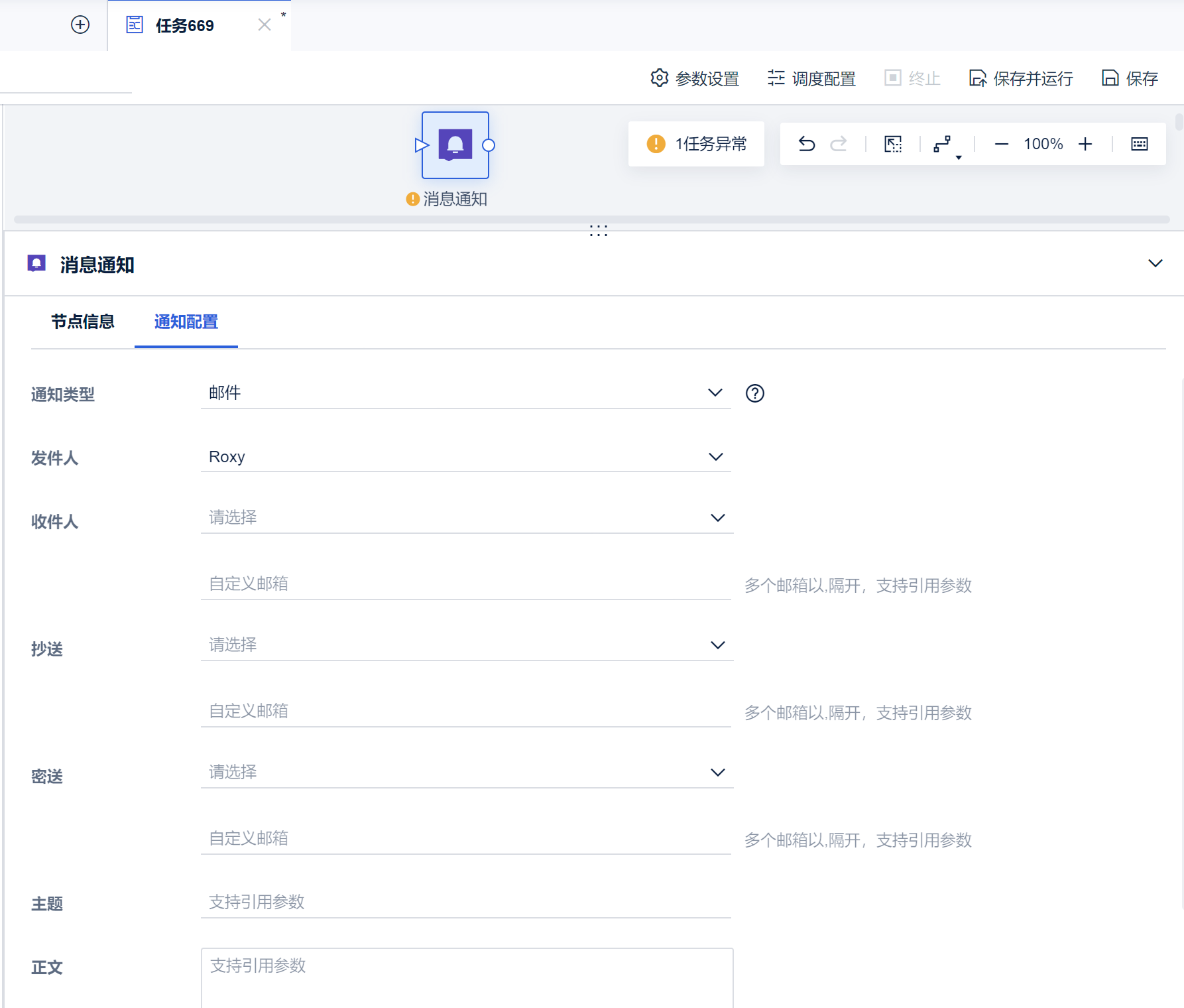 | 正文 | 填写邮件正文 支持通过${a}的方式引用参数值(a为参数) |
