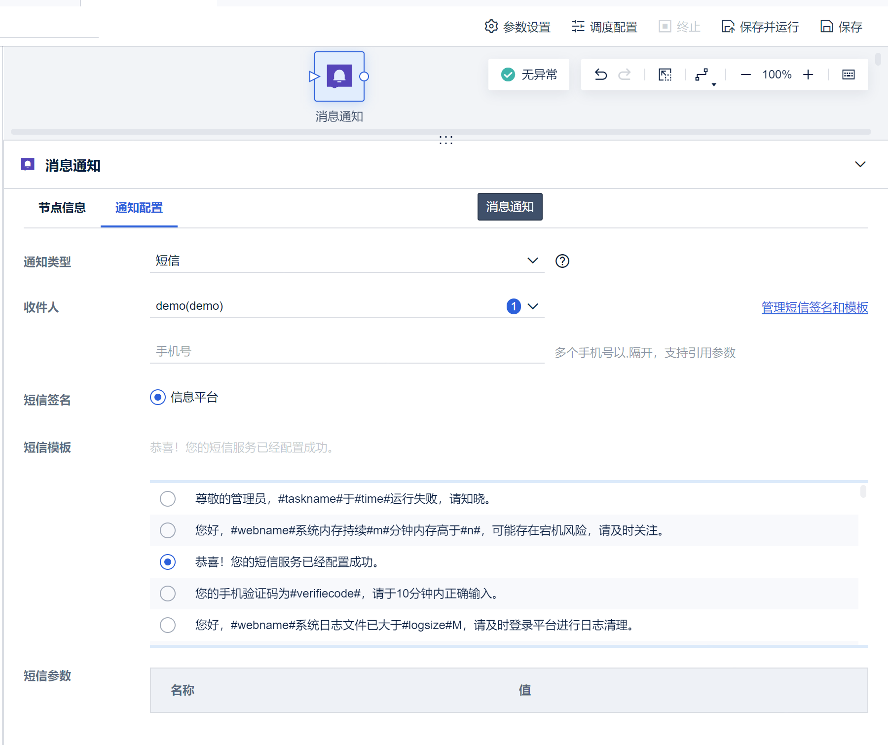 | 短信参数 | 传入短信模板的参数。名称默认显示所选短信模板包含的所有参数,值为空: