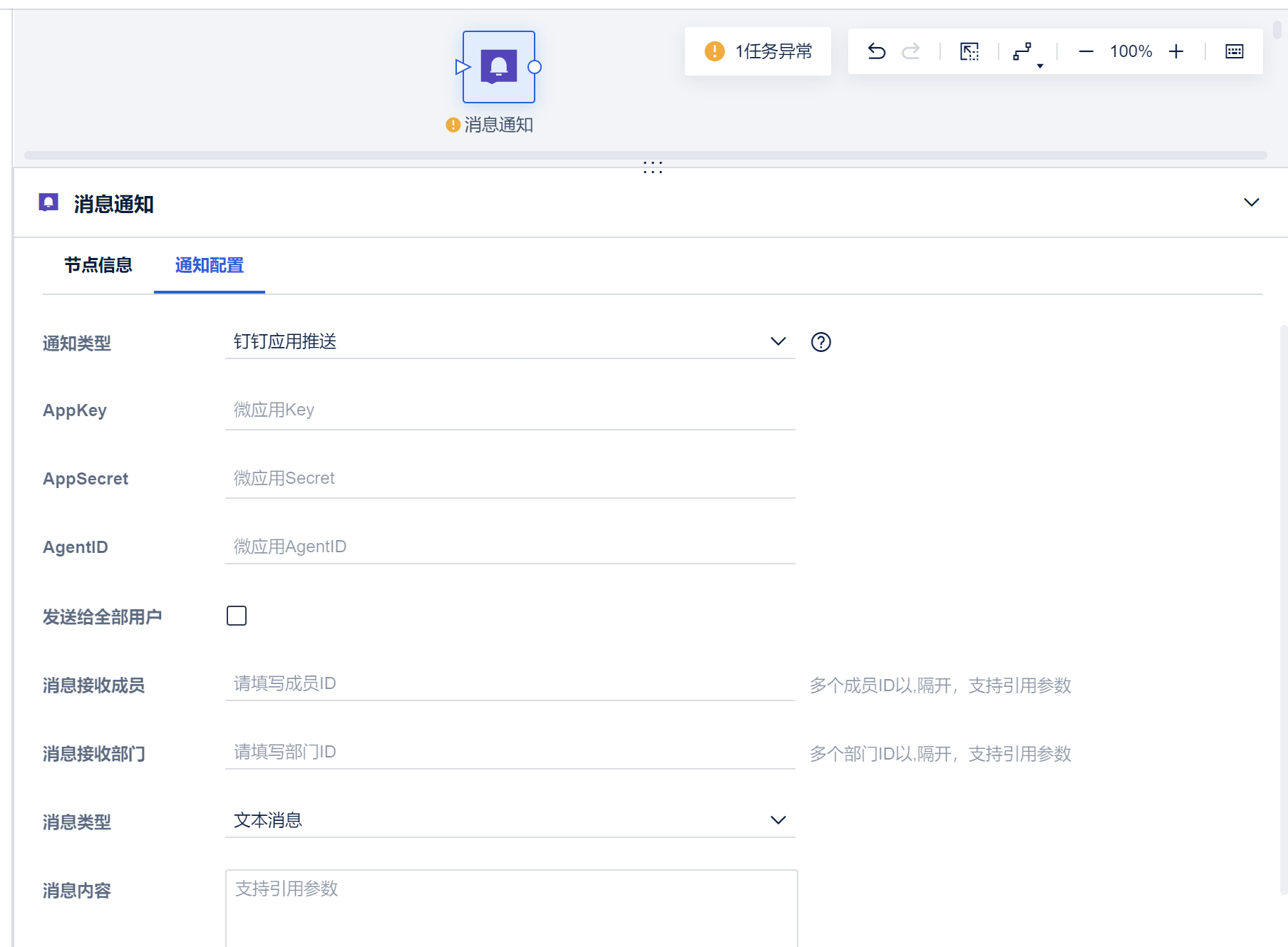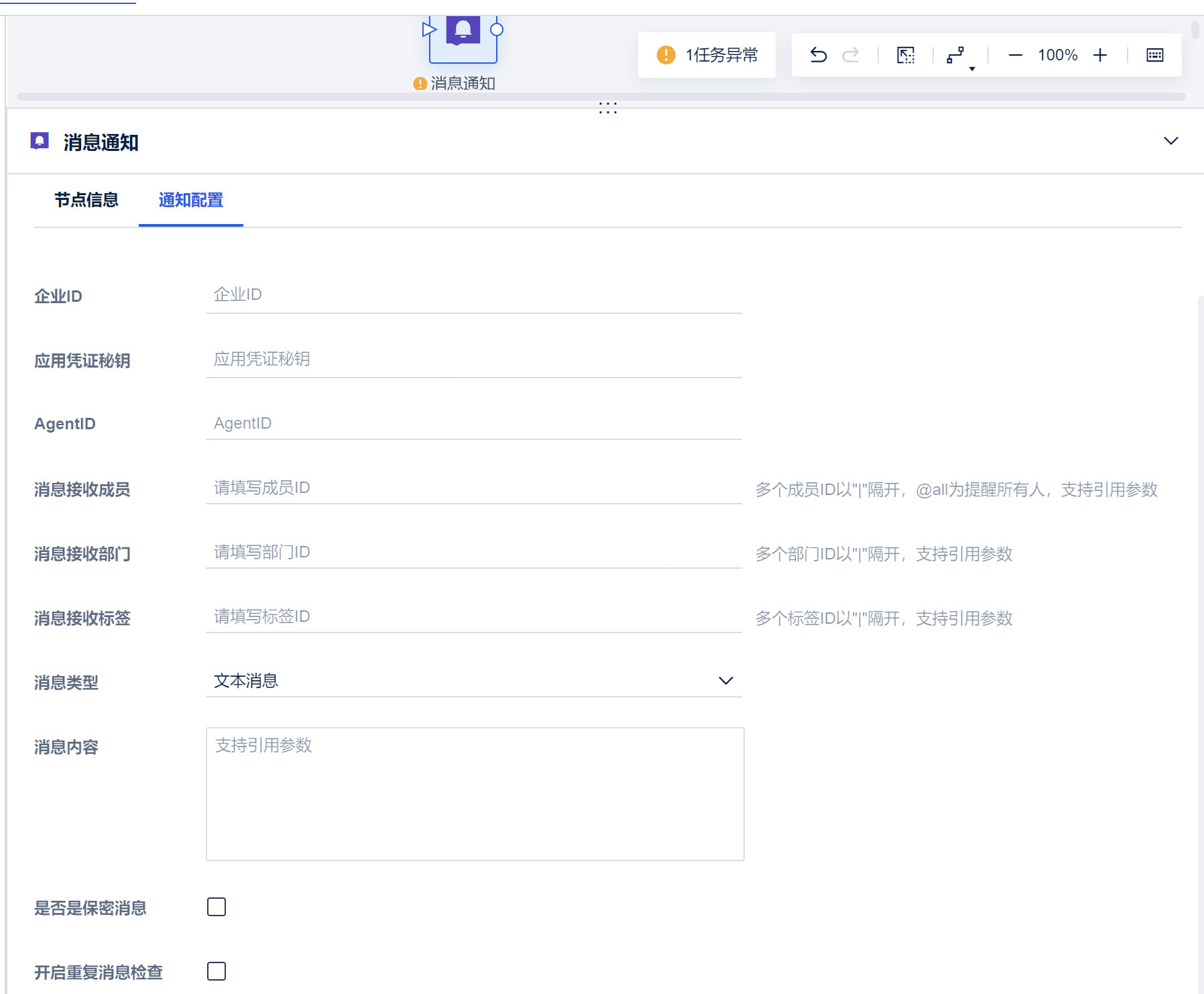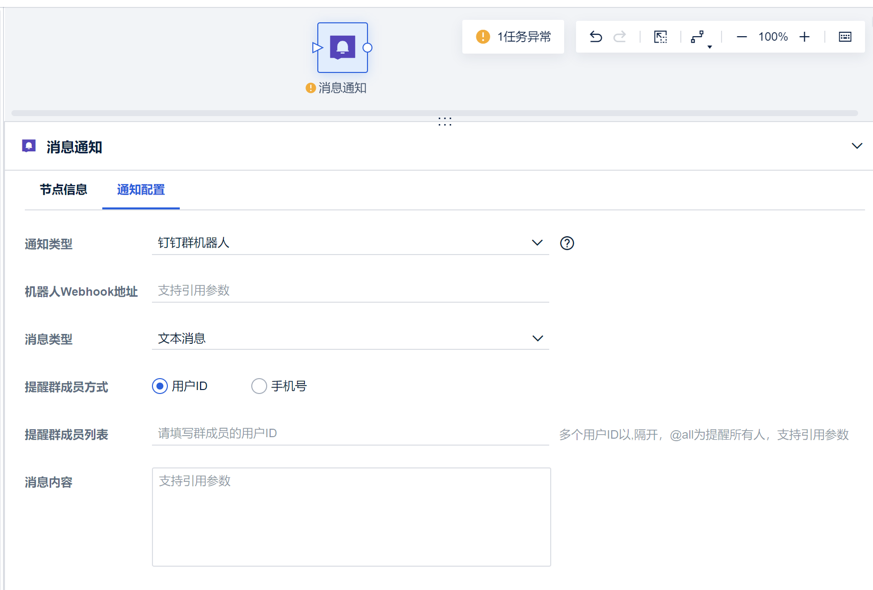 | 消息内容 | 填写消息内容,允许引用参数,不允许为空: