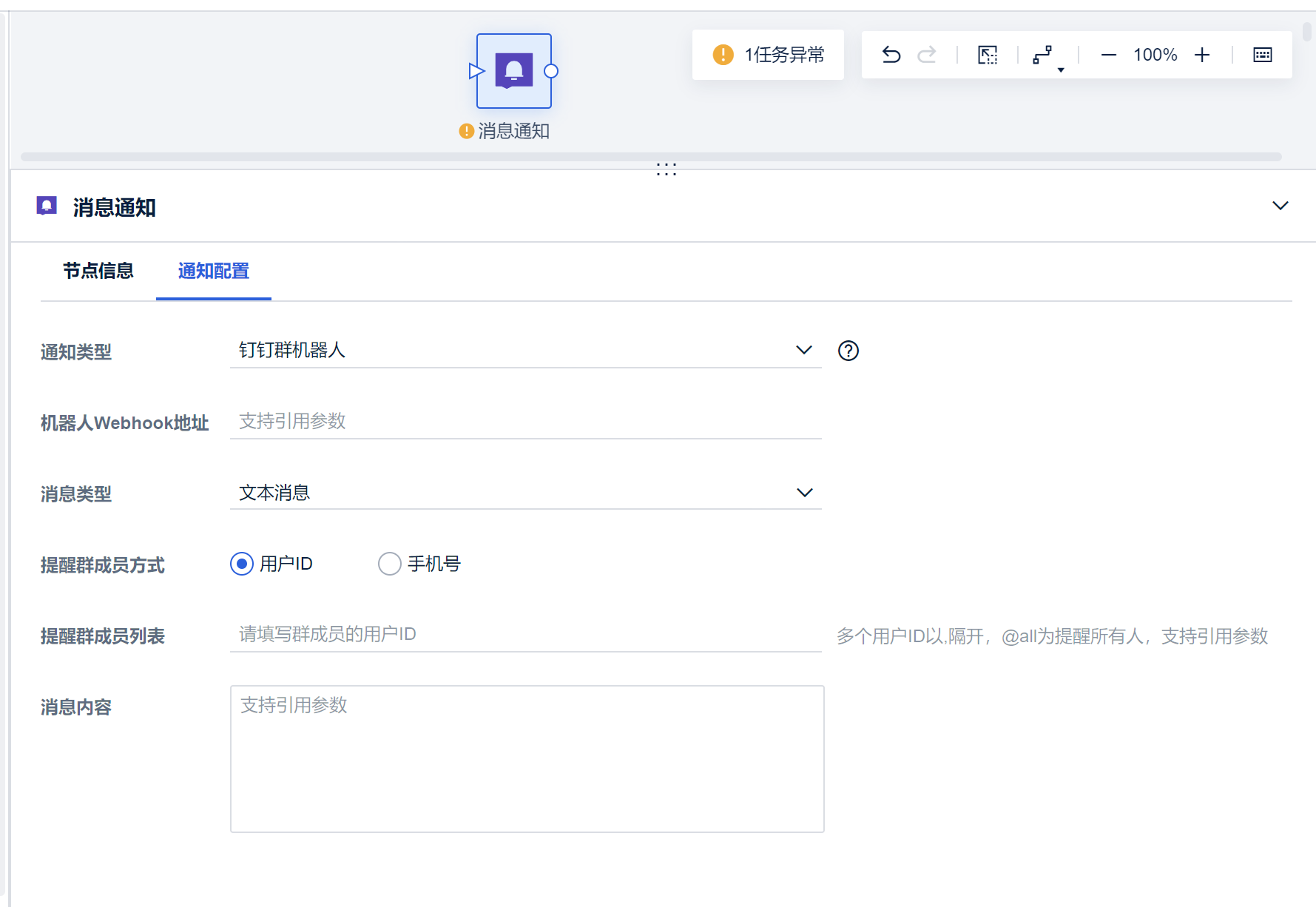 | 机器人Webhook地址 | 填写钉钉群机器人 Webhook 地址,允许引用参数,不允许为空 |