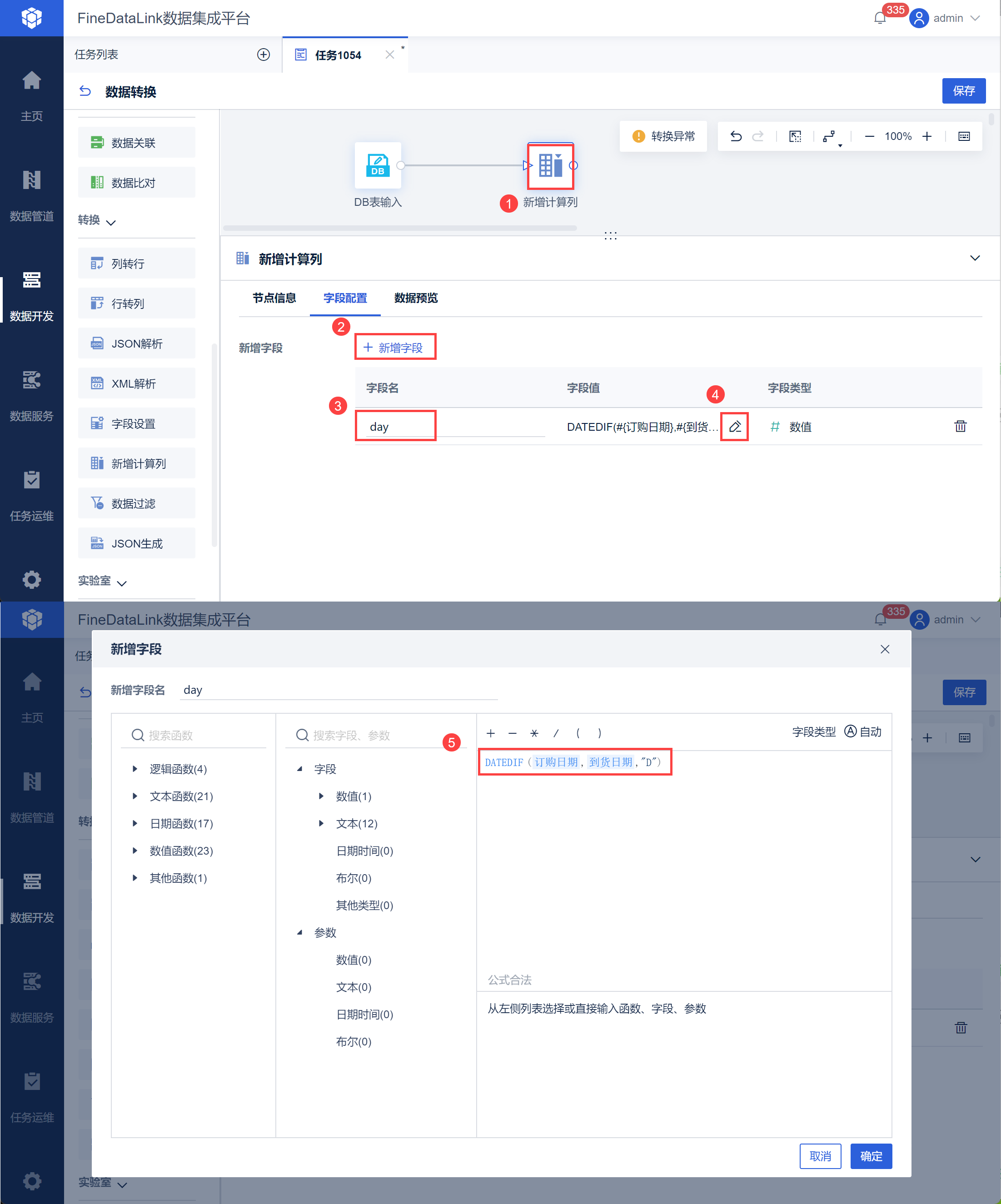 想要计算两个日期字段之间的间隔天数,例如「到货日期」和「订购日期」之间的间隔天数,新增一个字段,用 DATE 函数计算两者的天数,公式为:DATEDIF(订购日期,到货日期,"D"),如下图所示: