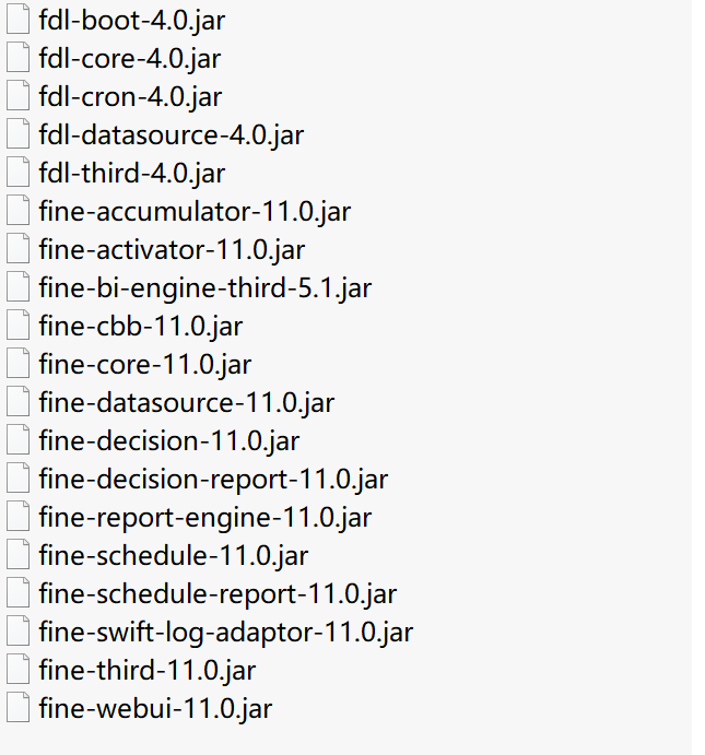 fdl-boot-4.0.jar、fdl-core-4.0.jar、fdl-cron-4.0.jar、fdl-datasource-4.0.jar、fdl-third-4.0.jar、fine-accumulator-11.0.jar、fine-activator-11.0.jar、fine-core-11.0.jar、fine-datasource-11.0.jar、fine-decision-11.0.jar、fine-decision-report-11.0.jar、fine-report-engine-11.0.jar、fine-schedule-11.0.jar、fine-schedule-report-11.0.jar、fine-swift-log-adaptor-11.0.jar、fine-third-11.0.jar、fine-webui-11.0.jar、fine-cbb-11.0.jar、fine-bi-engine-third-5.1.jar