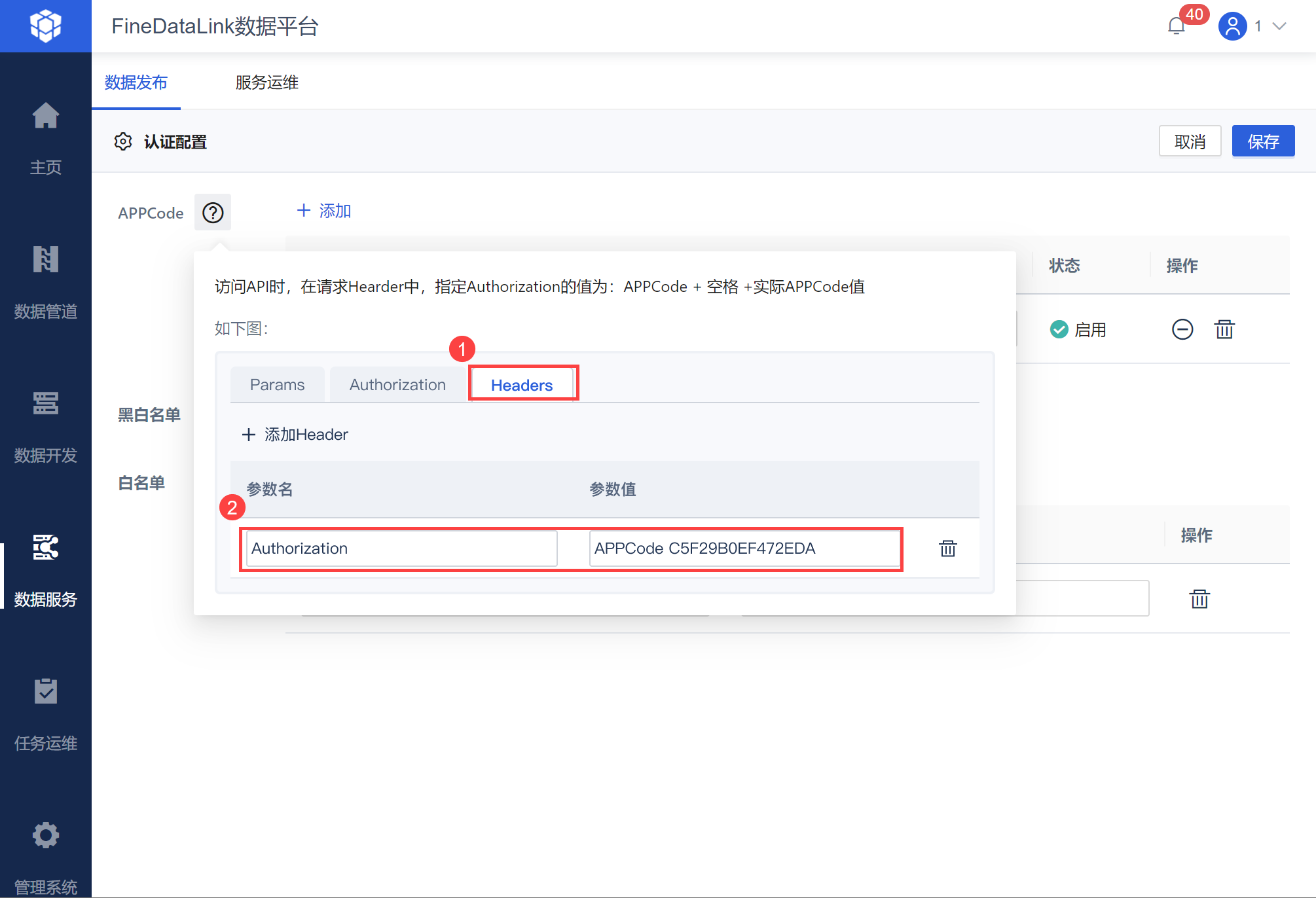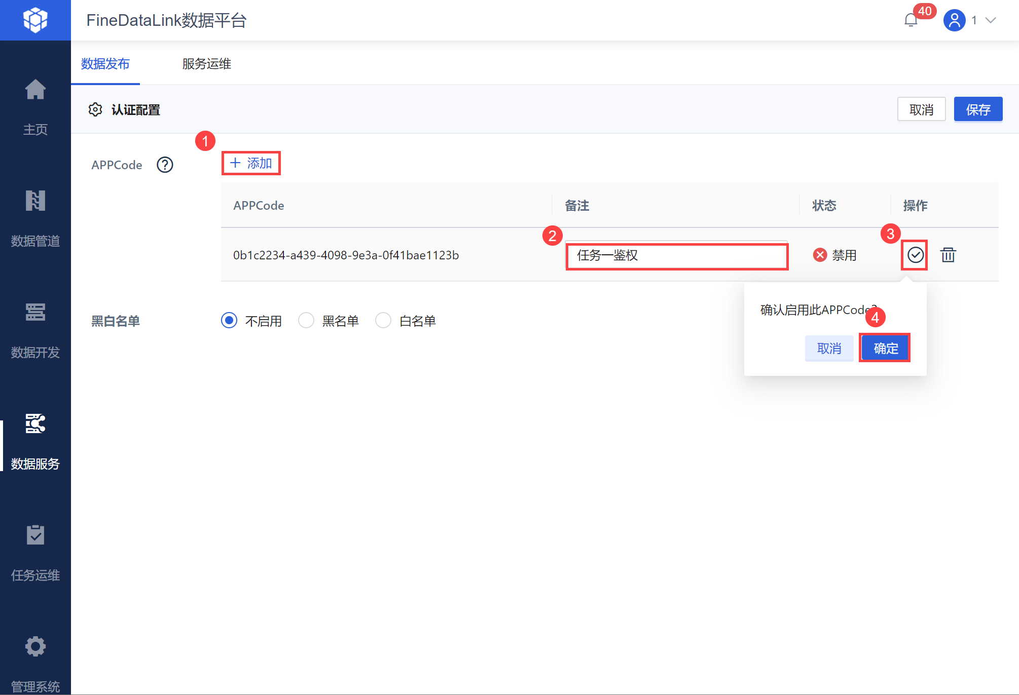 在进行数据发布之前,用户需要先配置好发布环境,也就是设置当前API发布后,外部系统调用需要输入的鉴权认证和开通黑白名单,以保证发布的 API 接口在被外部系统调用时更安全。