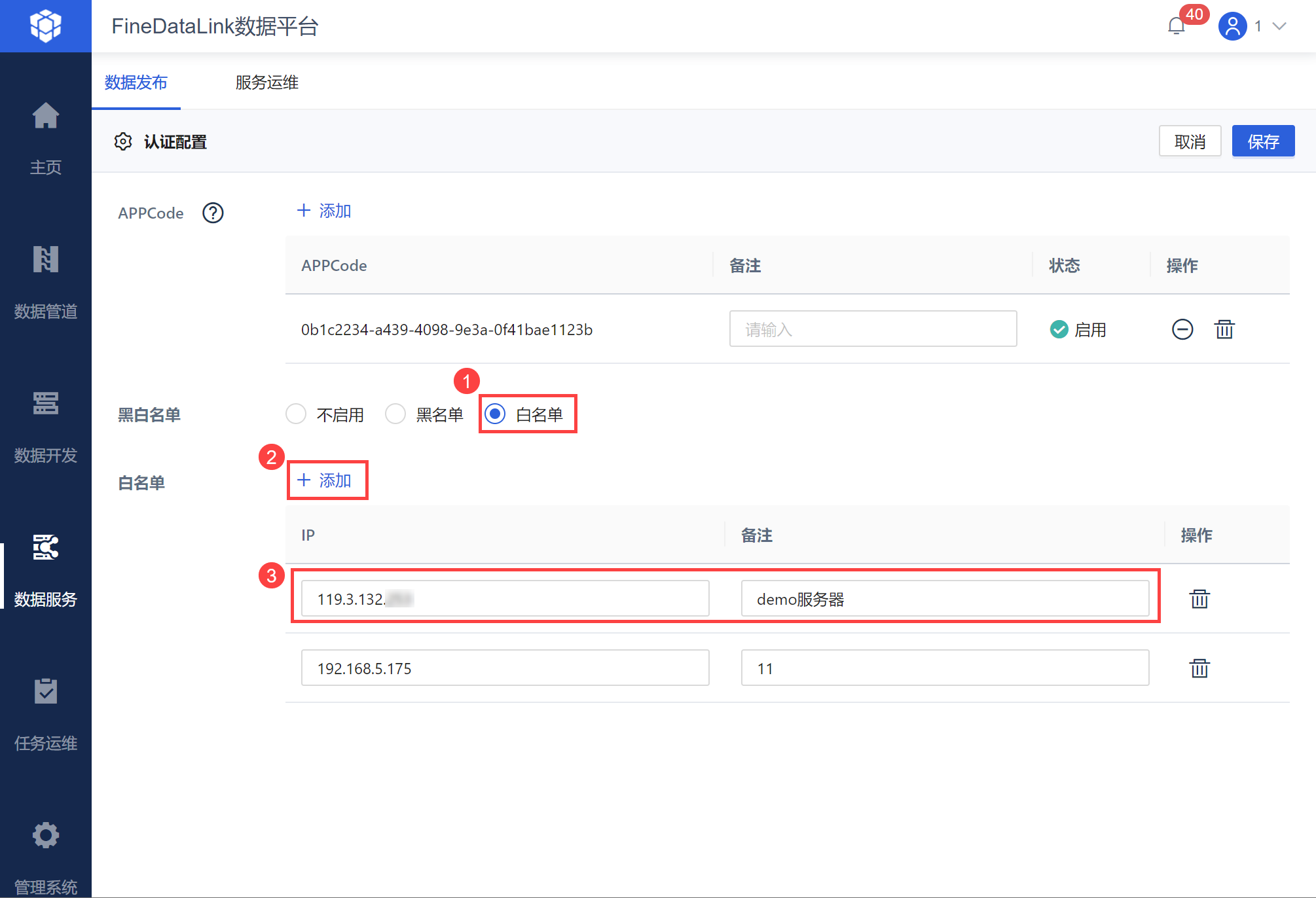 注:在保存设置时,如果白名单启用,则校验白名单列表不允许为空。 |