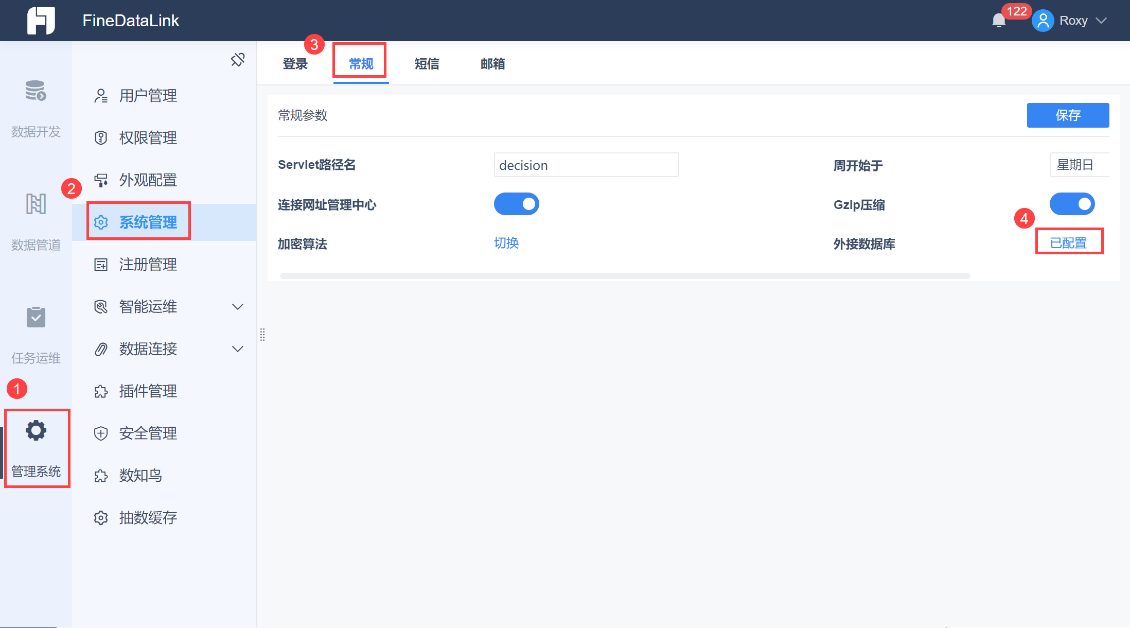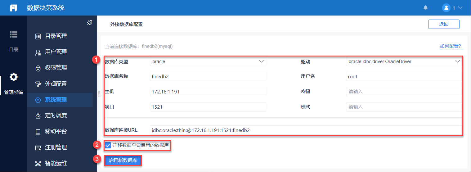 3)对于已启用外接数据库的系统,管理员登录数据决策系统,点击「管理系统>系统管理>常规>外接数据库>已配置」,可为系统迁移至新的外接数据库。如下图所示: