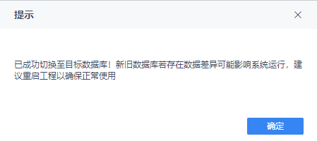 已成功切换至目标数据库!新旧数据库若存在数据差异可能影响系统运行,建议重启工程以确保正常使用