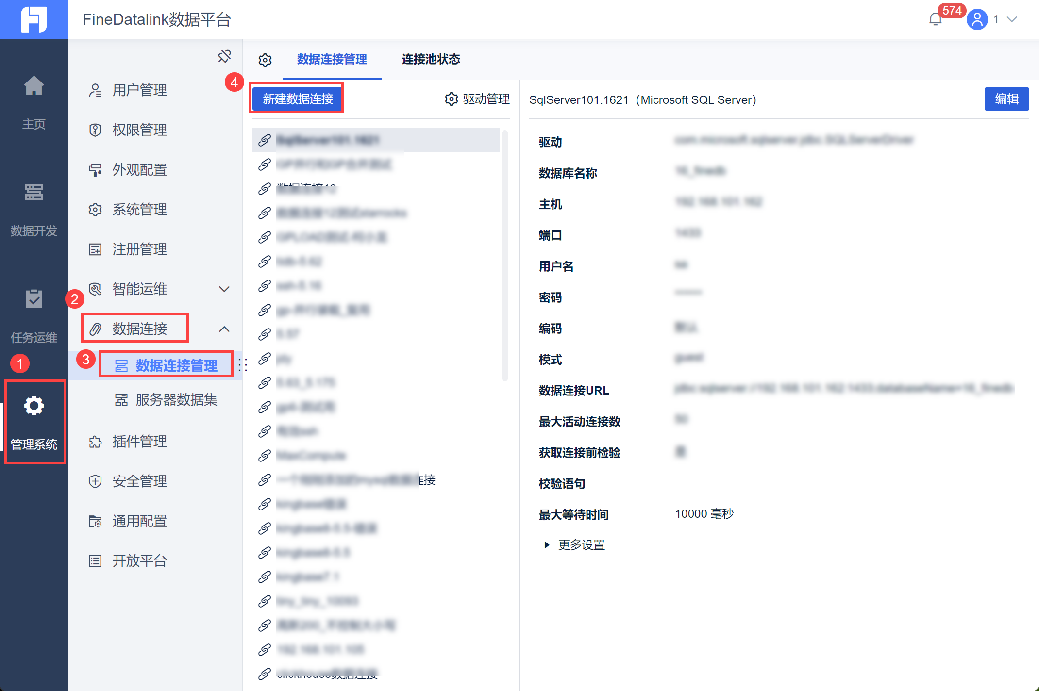 注:如果非管理员用户想要配置数据连接,需要管理员给其分配管理系统下数据连接节点的权限,具体操作请查看 数据连接权限