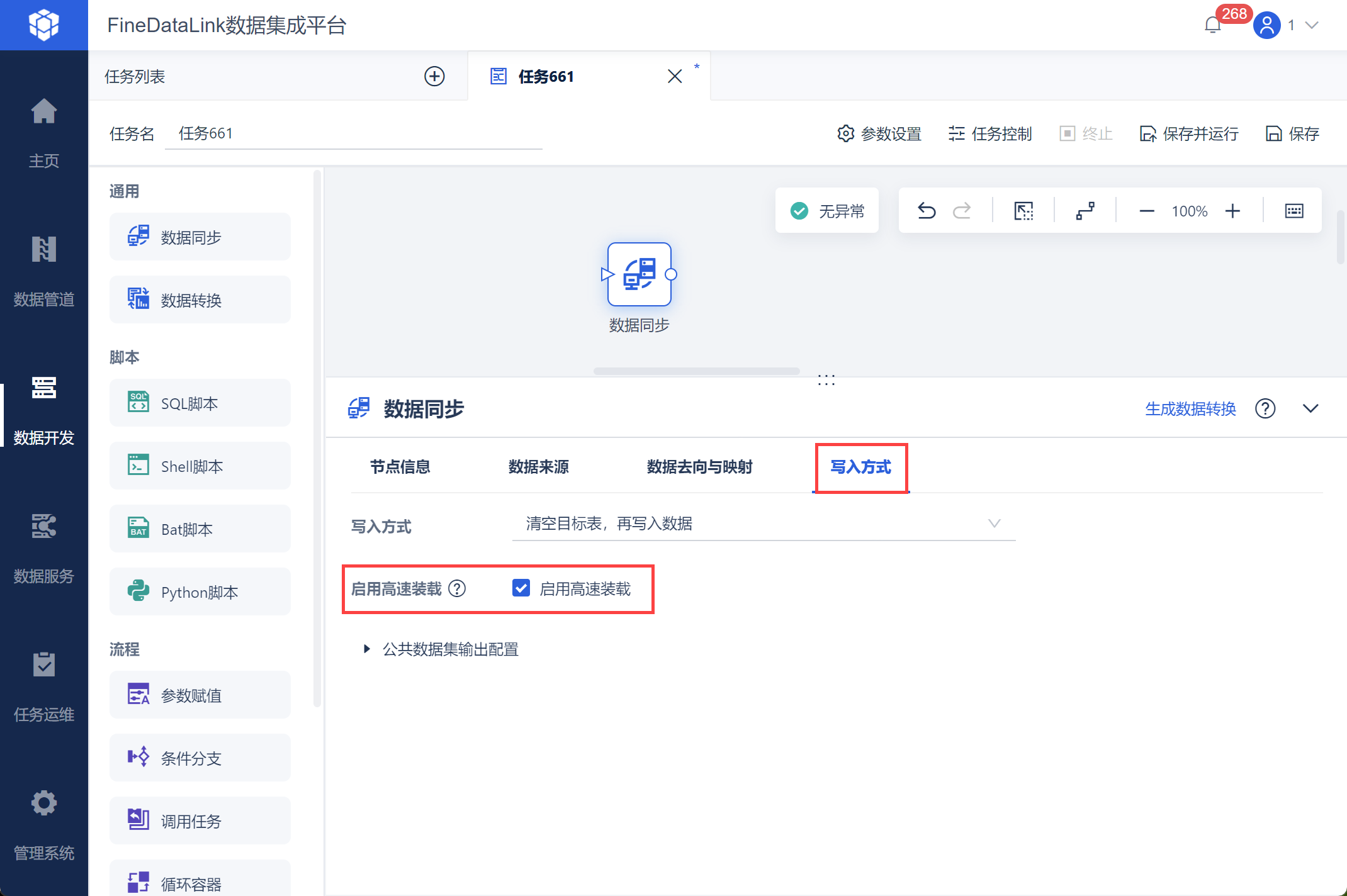 在「管道任务」中将数据源作为写入端。如果配置了本文第四节的高速装载,则可以选择是否启用高速装载,如下图所示: