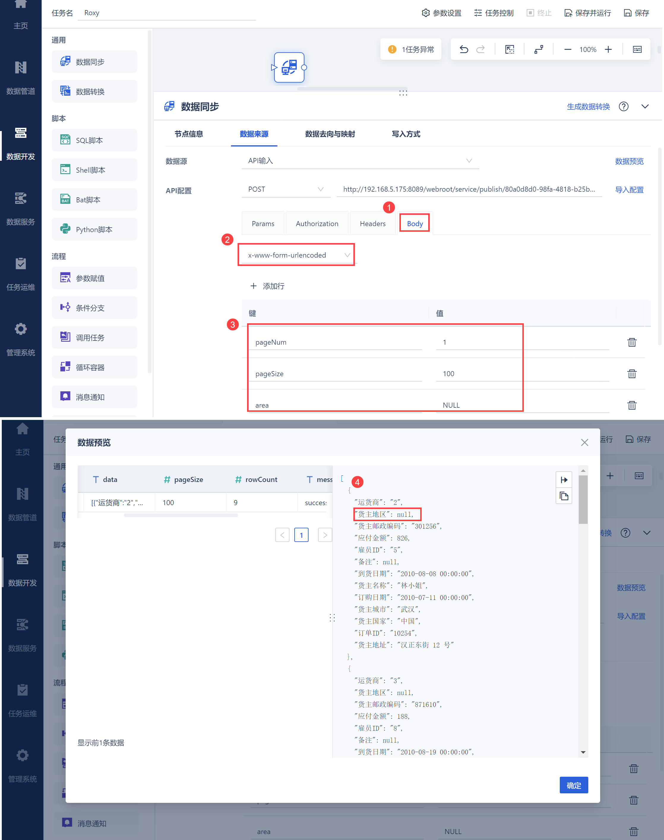 示例需要将 S订单中数据发布为 API,并在取数时可取出地区数据为 NULL 值的数据。