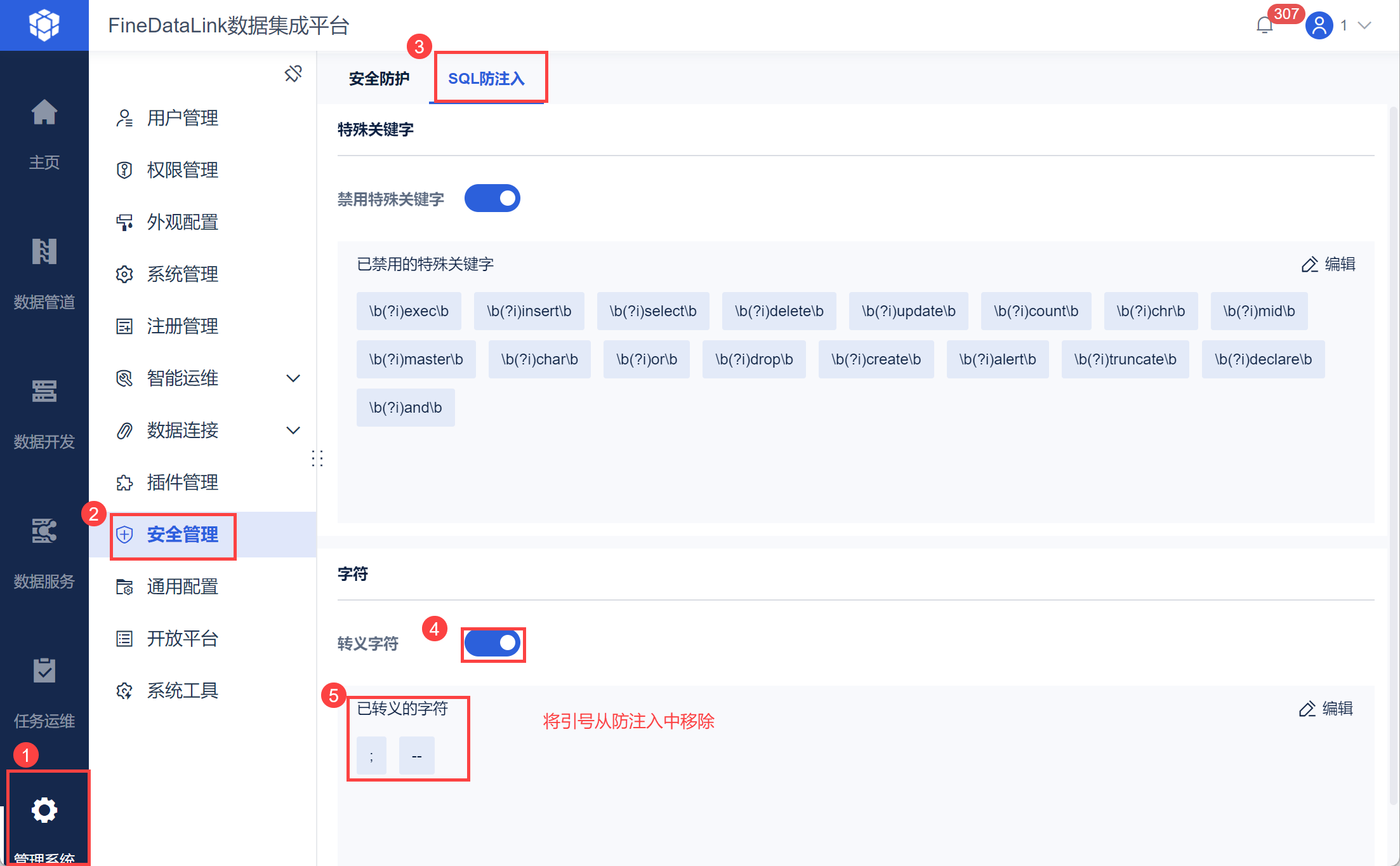 若用户想要在 SQL 语句中加引号,则可以在SQL 防注入 中将转义字符引号取消选择。