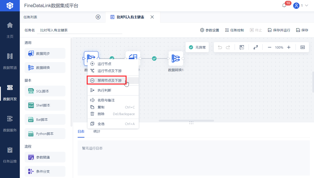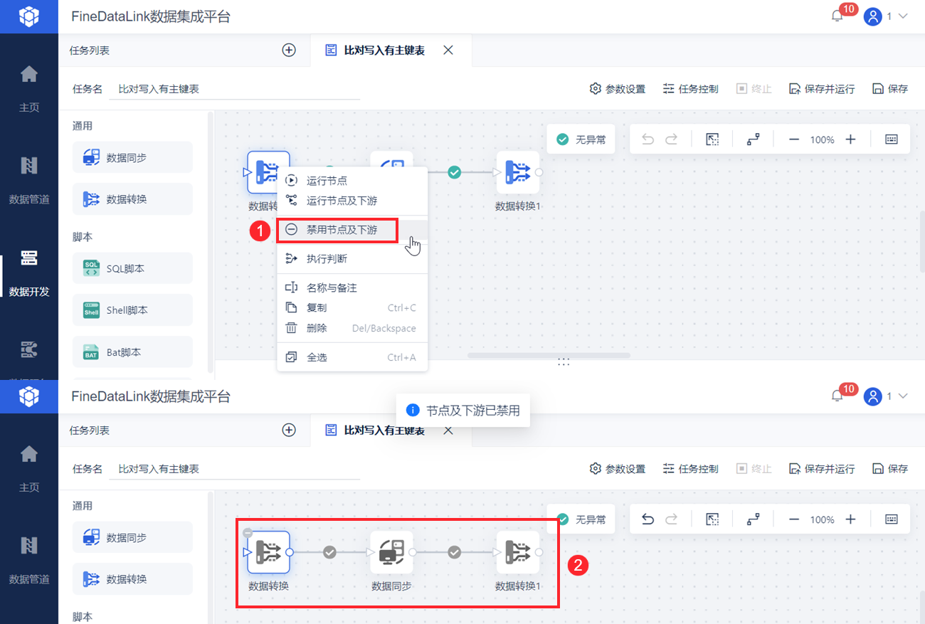 鼠标右键点击需要禁用的节点,选择「禁用节点及下游」,即可禁用该节点和该节点的下游节点。如下图所示: