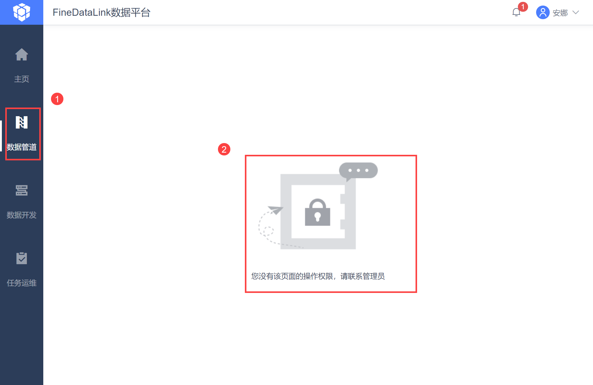 此时,如果不进行 2.3 节分配任务权限,则用户登录后,将无法进行数据管道任务的操作,如下图所示:
