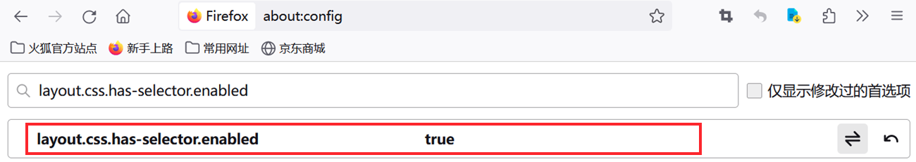 火狐浏览器的 103 及之后版本,实际已经支持 has 特性,但默认为关闭状态,需要通过以下步骤进行开启: