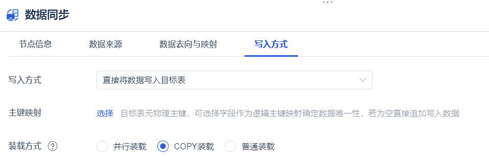 | COPY装载(4.1.2 版本新增) | 1)选择该方式时,支持写入二进制字段、JSON 字段 2)写入方式选择「直接将数据写入目标表」时,目标表有主键或配置主键映射后,支持三种主键冲突策略:主键相同,忽略输入源的数据、主键相同,记录为脏数据、主键相同,覆盖目标表的数据 3)开启 脏数据容忍 后,COPY 装载方式失败后,需要尝试将该批数据使用「普通装载」写入,写入异常将统计进入脏数据,当前这一批数据写完后,下一批继续优先尝试使用 COPY 进行装载 关闭脏数据容忍后,COPY 失败时直接报错,不再降级至普通 JDBC 处理 若选择 COPY 装载方式,需要在目标数据库先创建 fdl_temp 模式用来存放临时表,需要用户有建表、建指定模式的权限(如果已由 DBA 建好模式并赋权,数据库用户可不需要建schema的权限) |
