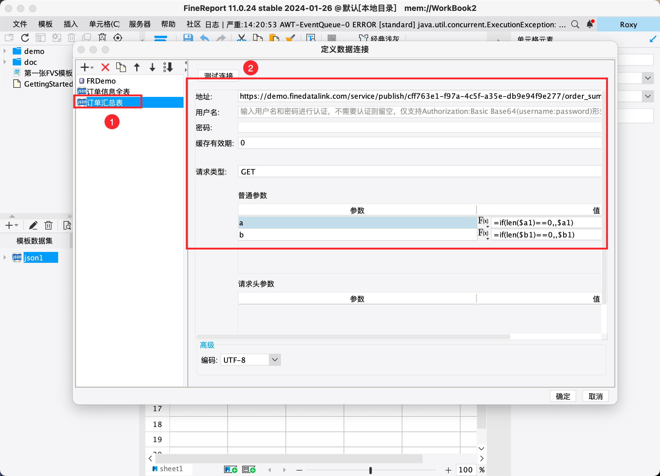 同理对「订单汇总表」数据连接创建「Json数据集」,如下图所示: