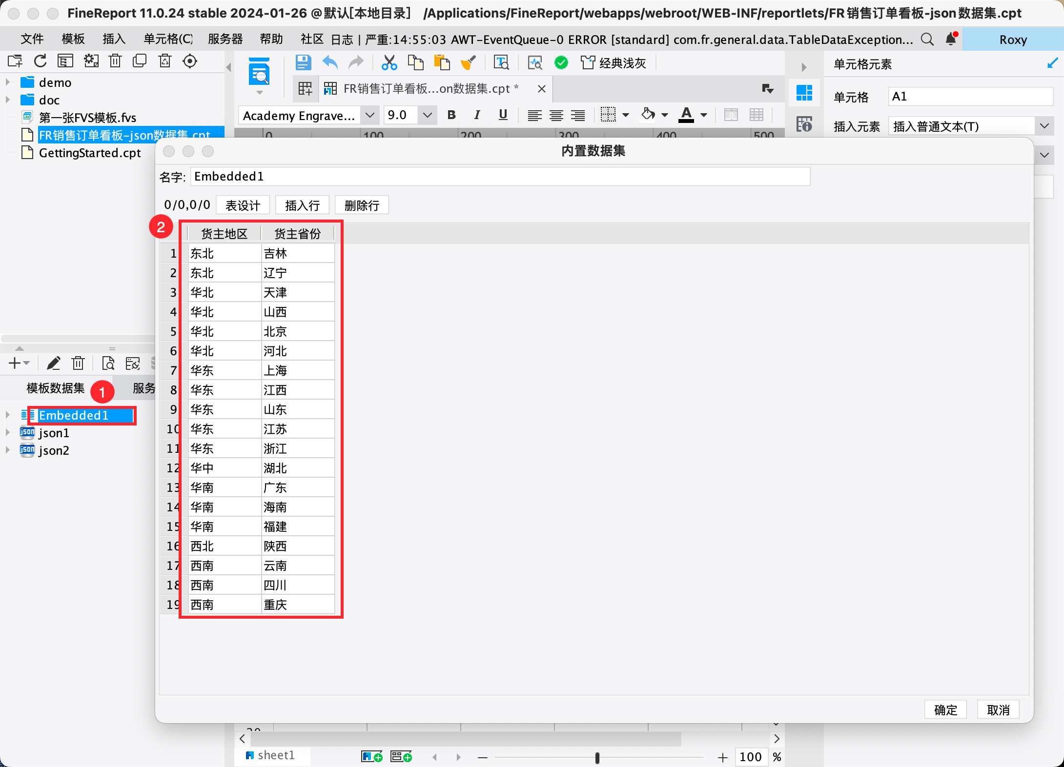 在报表设计界面,点击模板数据集>新建>内置数据集,定义好货主地区和货主省份的对应关系,如下图所示: