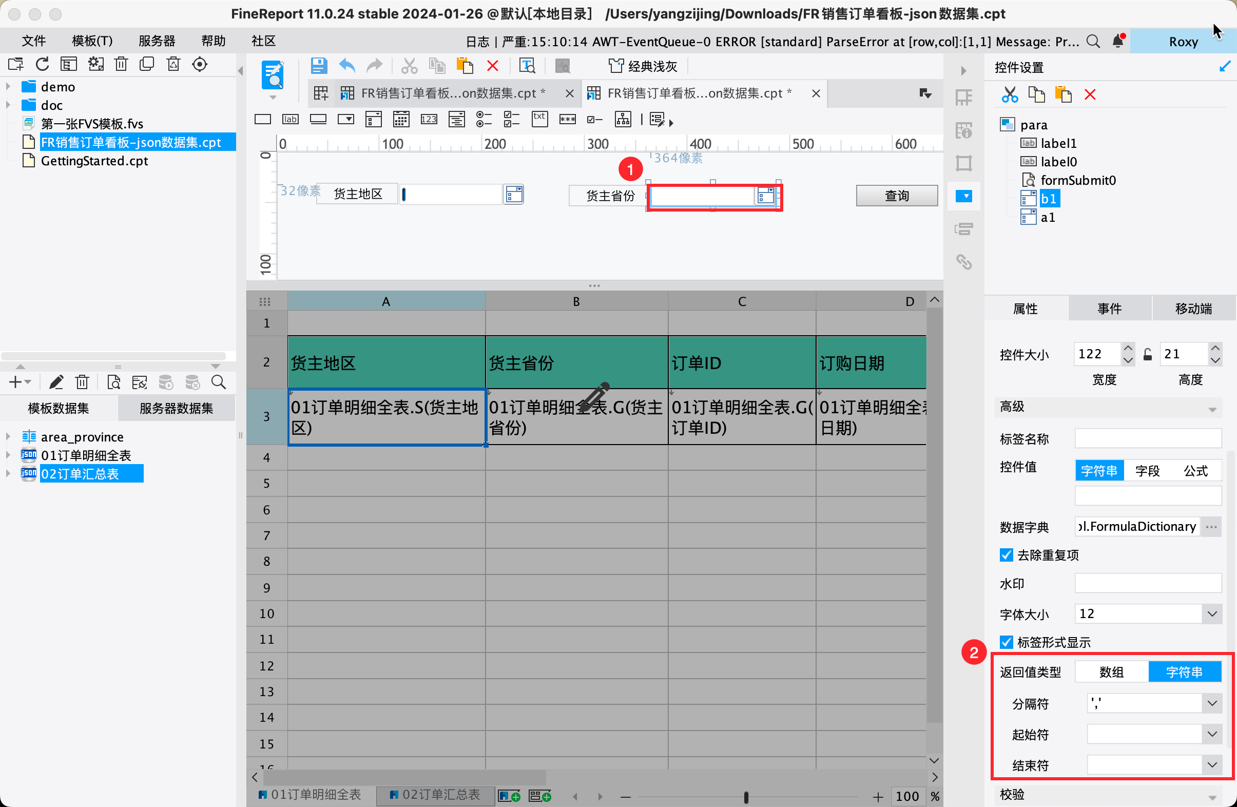 设置「货主地区」控件:编辑参数面板,拖入下拉复选框控件,设置控件名称为 a1,并设置控件数据字典,选择上一步创建的内置数据集的货主地区字段,如下图所示: