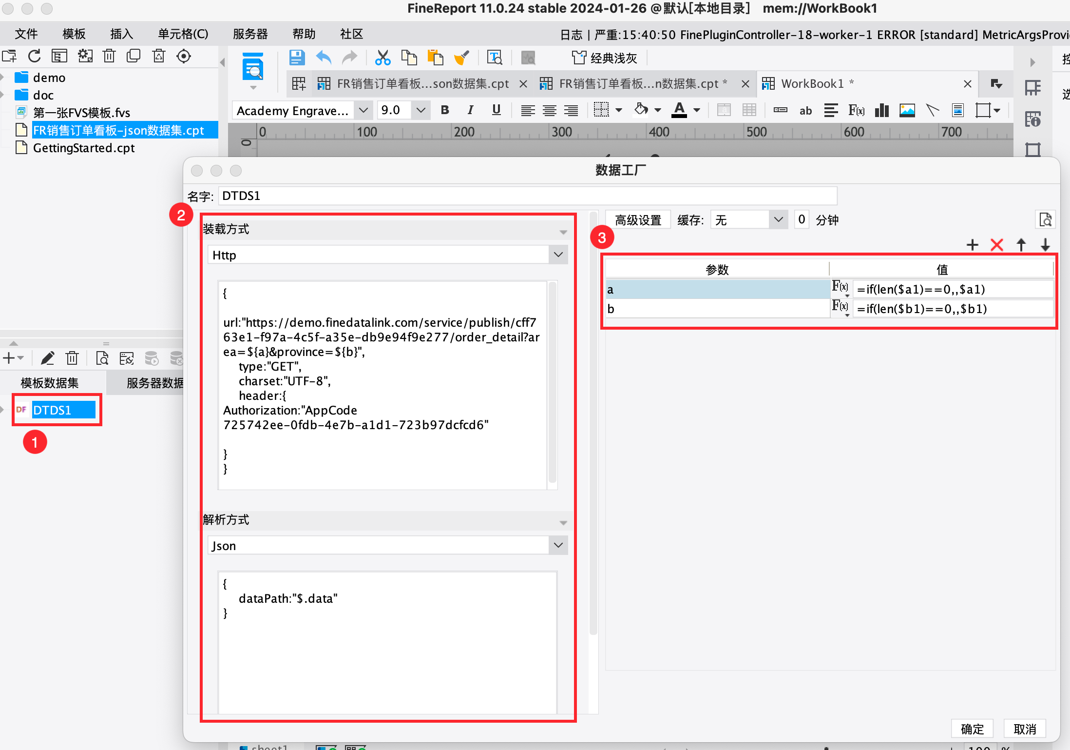 方案一:使用JSON 数据集插件在报表设计器或决策平台安装插件,接收数据服务 API 数据并制作看板。