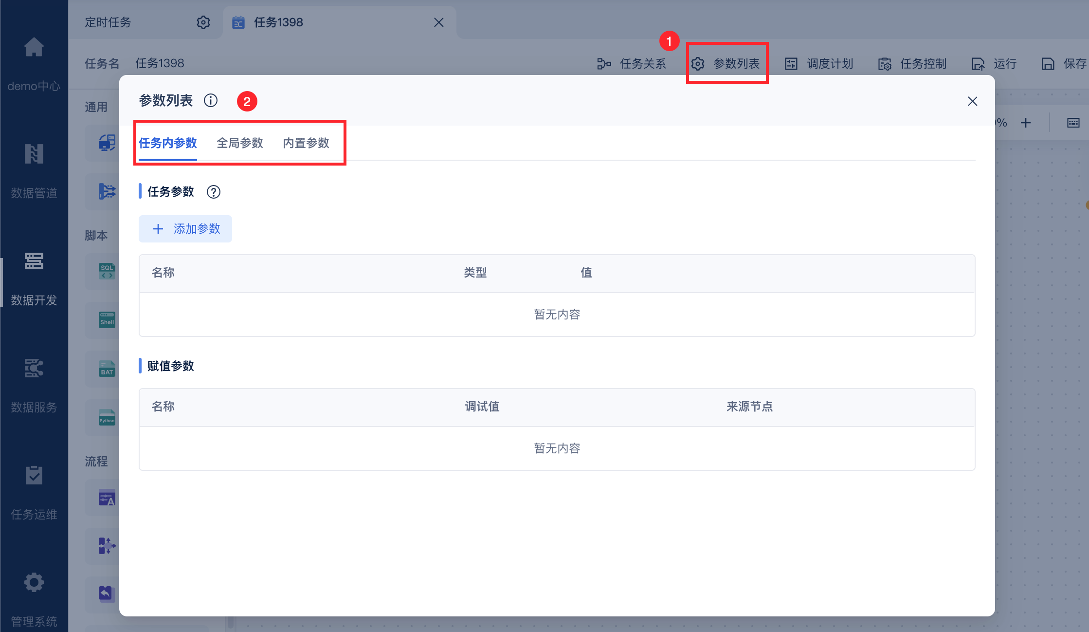 | 任务内参数 | 任务参数(自定义参数) | 可以使用自定义参数来满足定制化需求 | 可以被当前任务内的所有节点引用 |