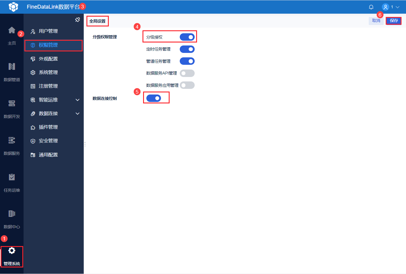 超级管理员 FineDataLink 系统,点击「管理系统>权限管理>全局设置」,开启「分级授权」按钮同时开启「数据连接控制」按钮,点击「保存」。如下图所示: