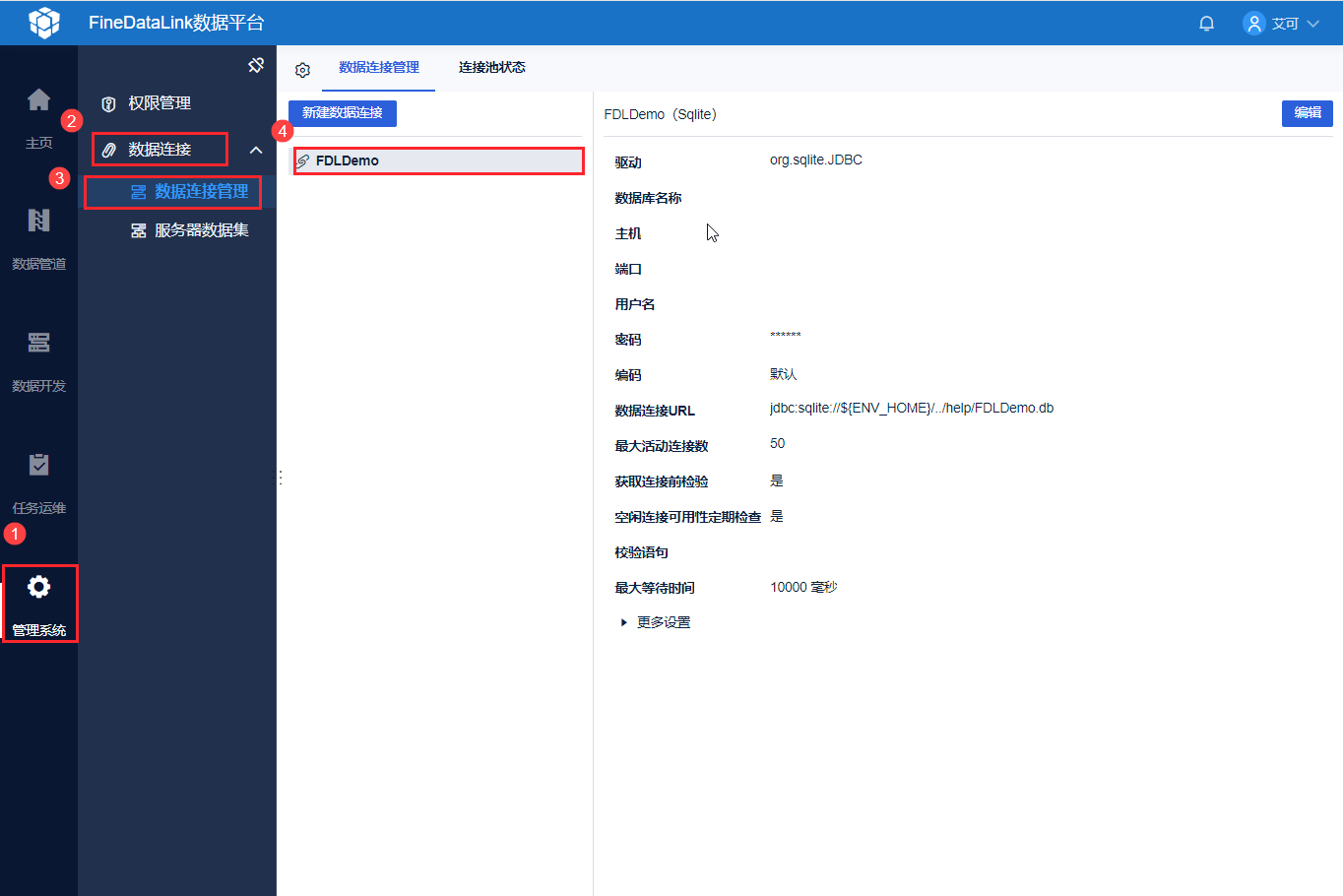 1)可看到 FDLDemo 数据连接的具体信息,且可对其进行管理,包括测试连接、编辑、重命名、复制、删除等操作。