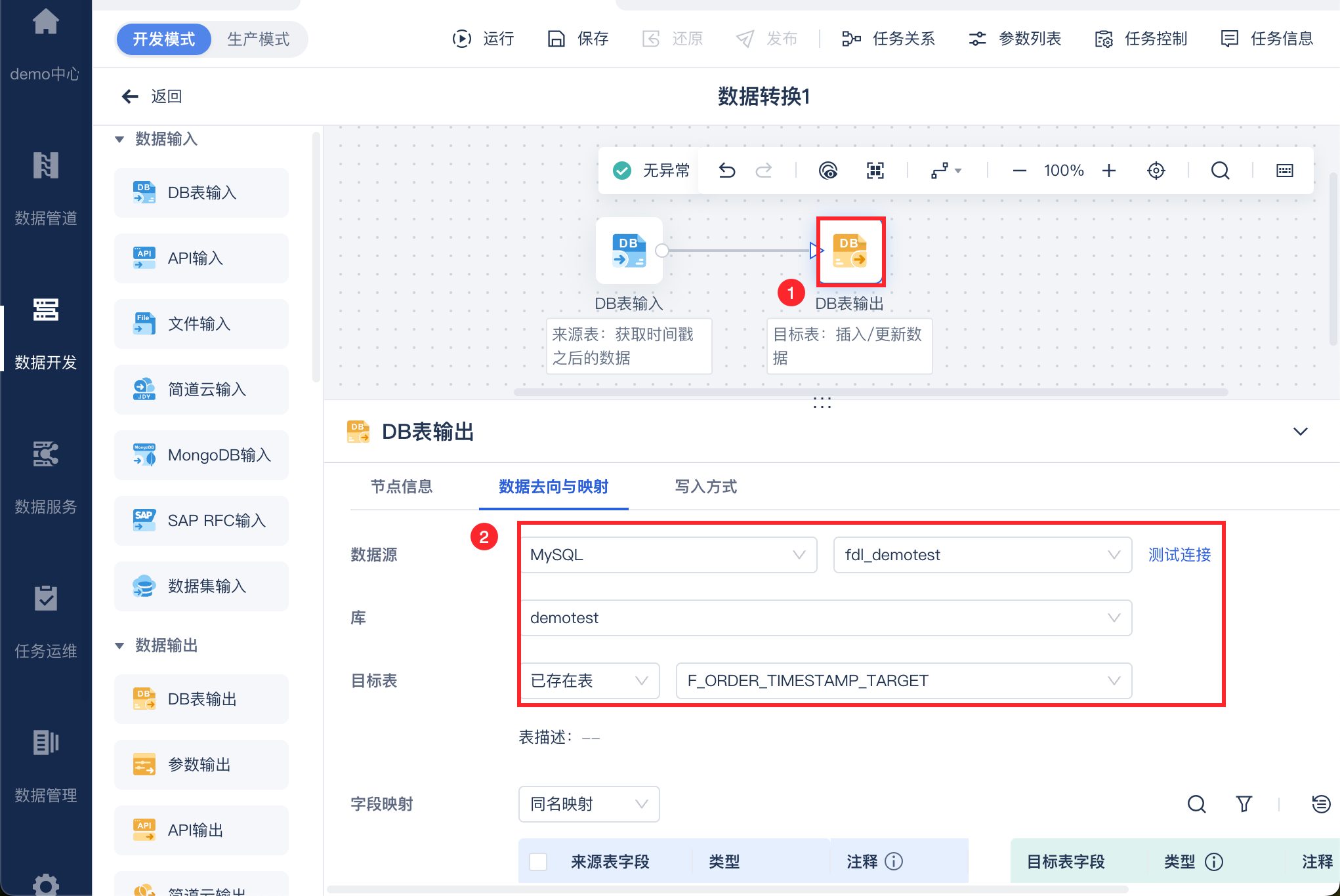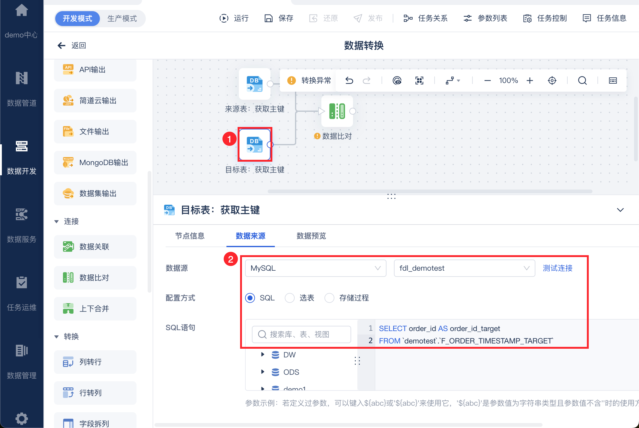 创建定时任务后,使用「数据转换」节点,进入编辑界面,使用DB表输入功能,获取来源表中主键 order_id_from,如下图所示: