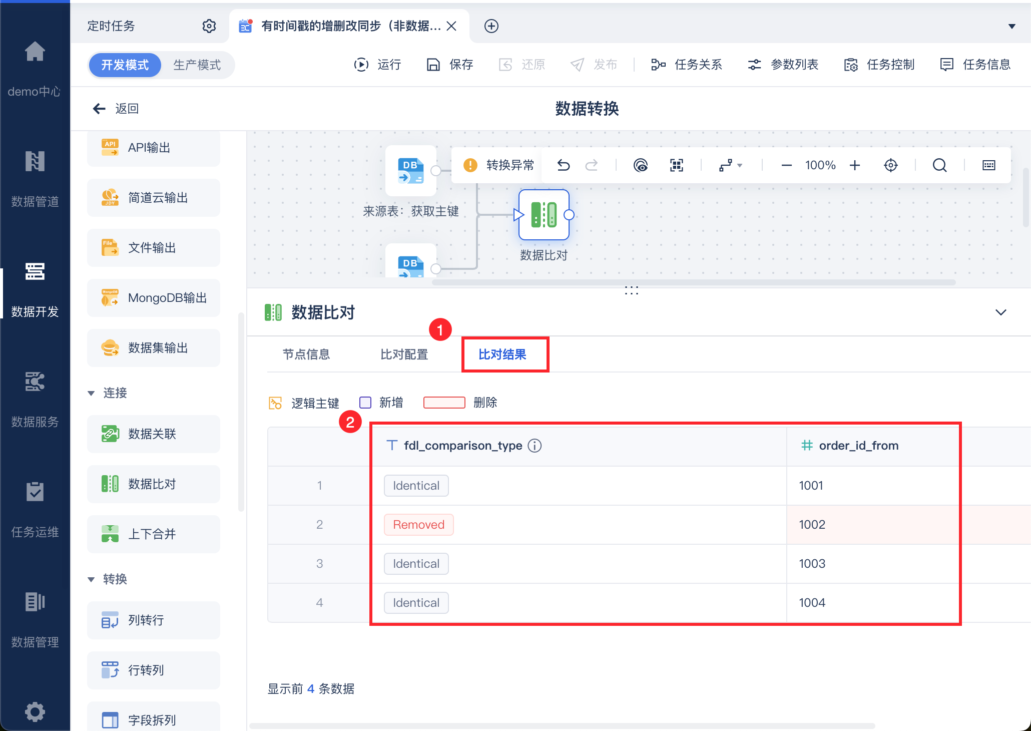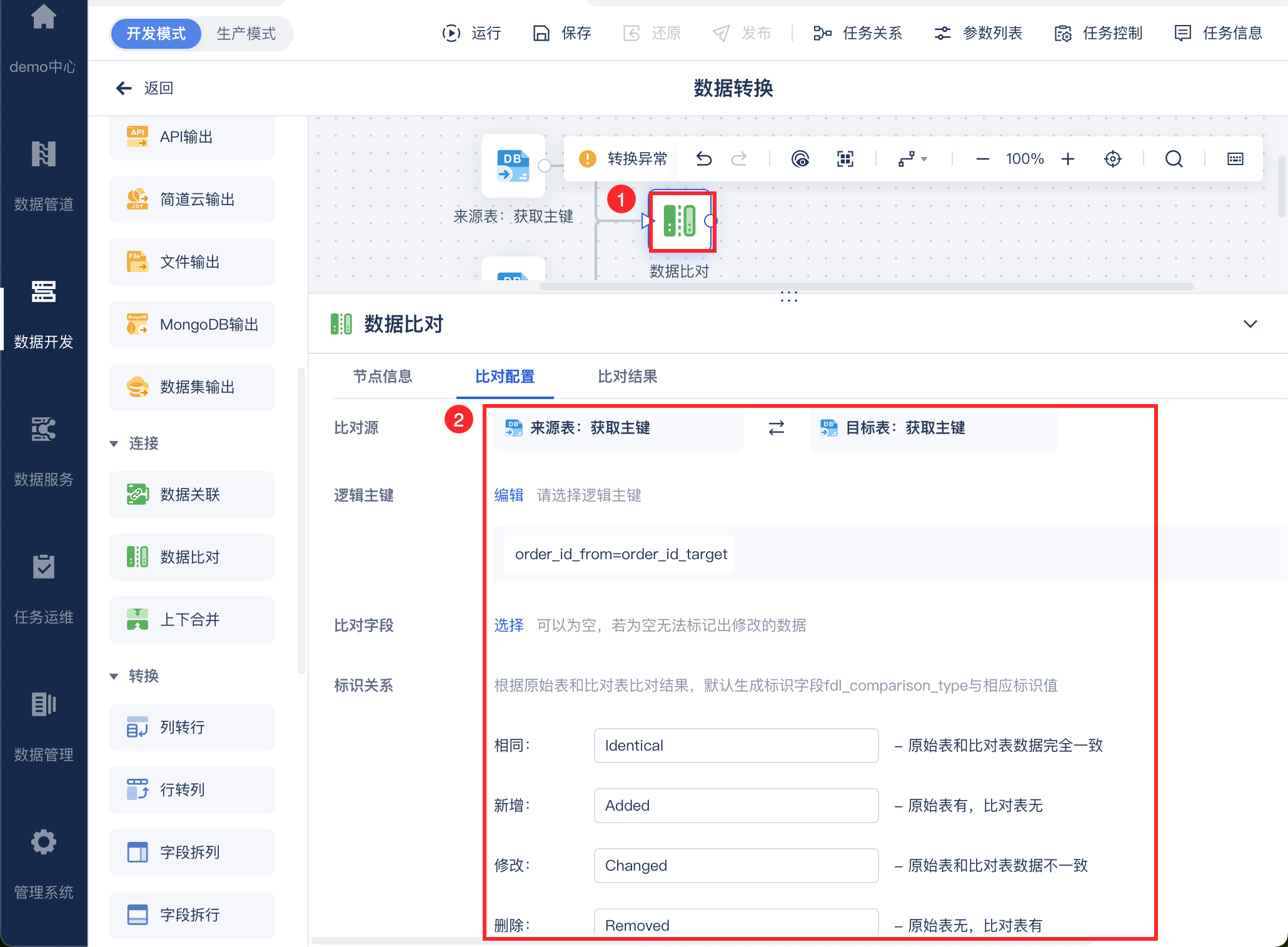使用「数据比对」算子,比对来源表和目标表的 order_id 主键,获取来源表删除但是目标表还存在的数据,如下图所示: