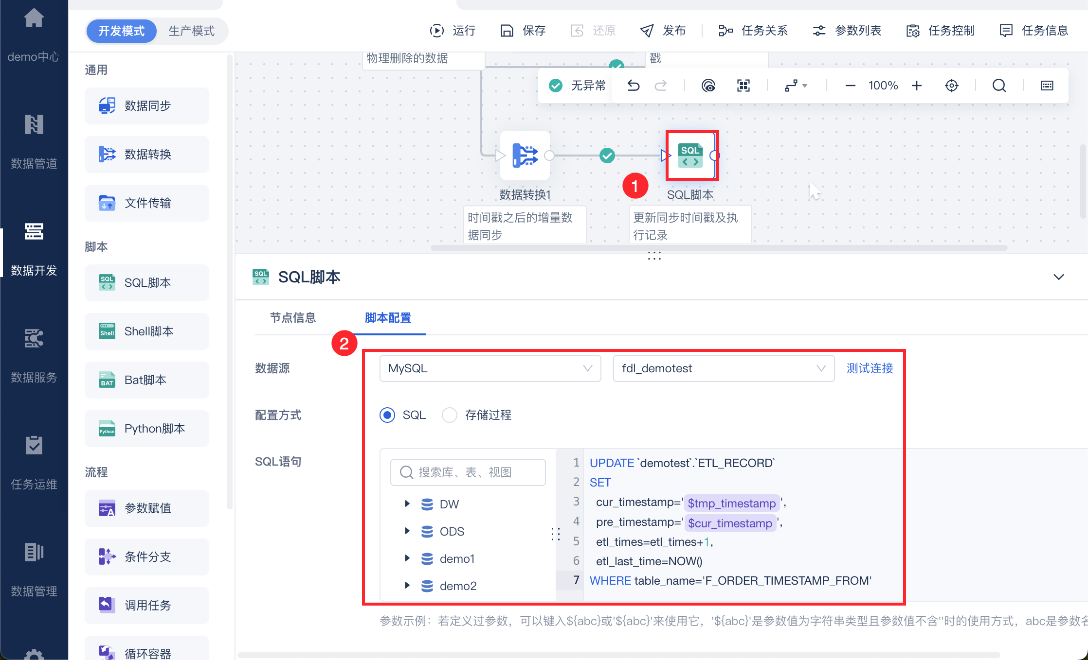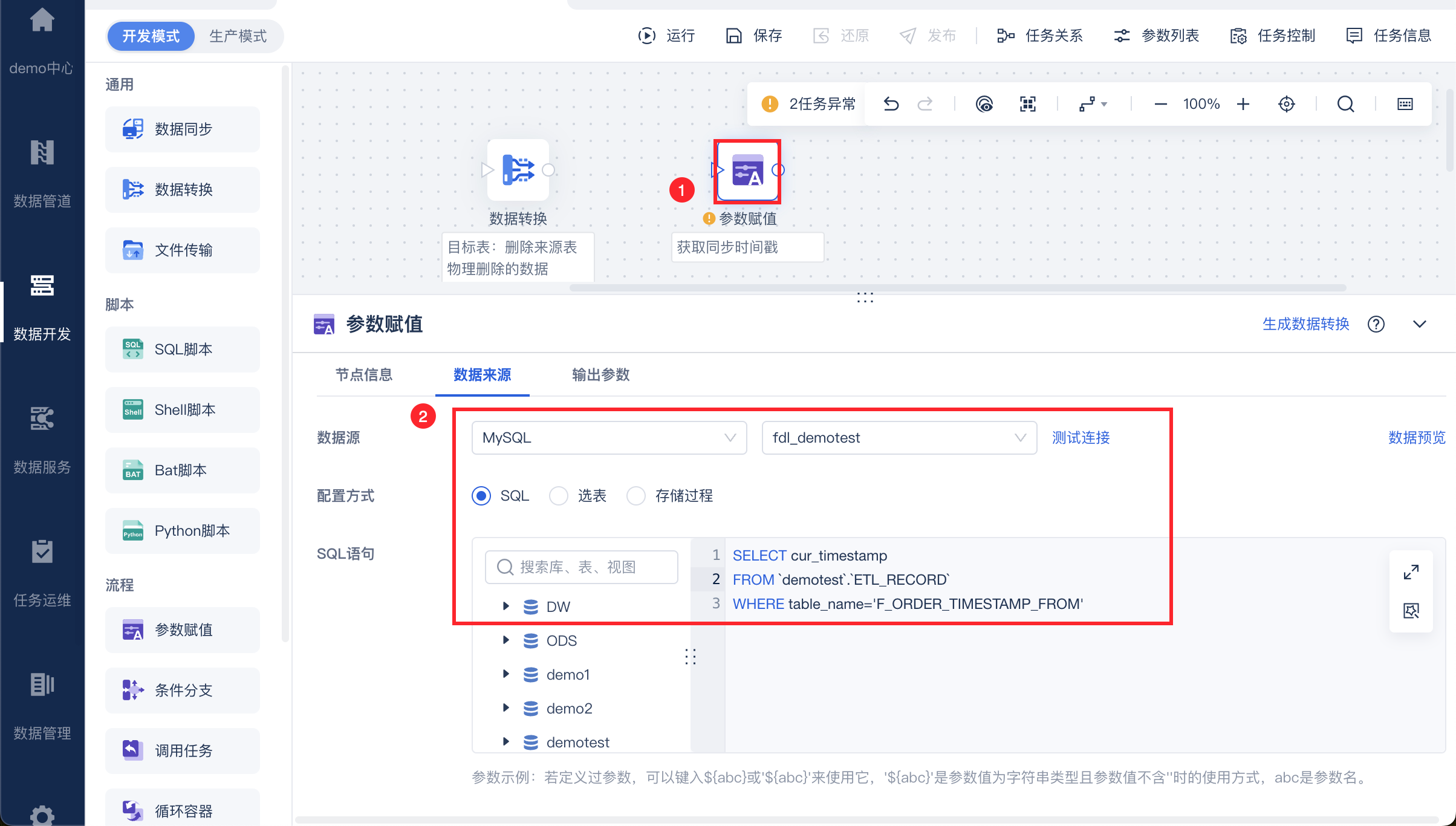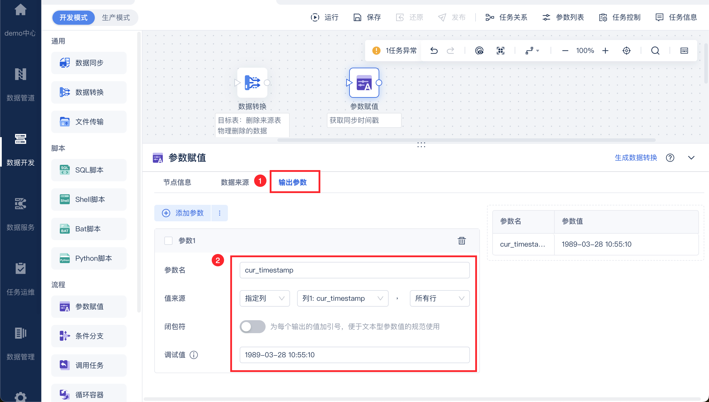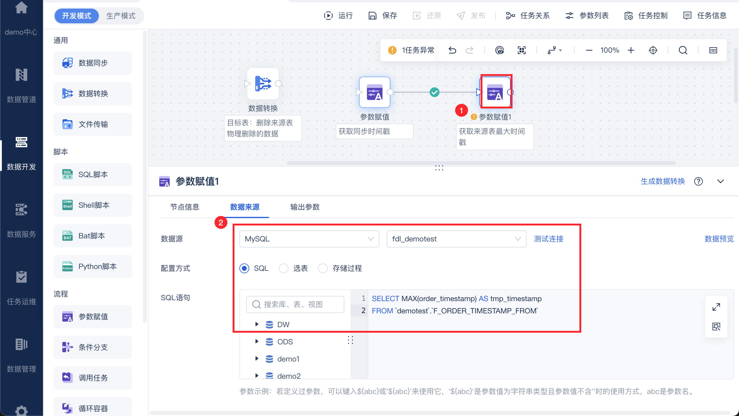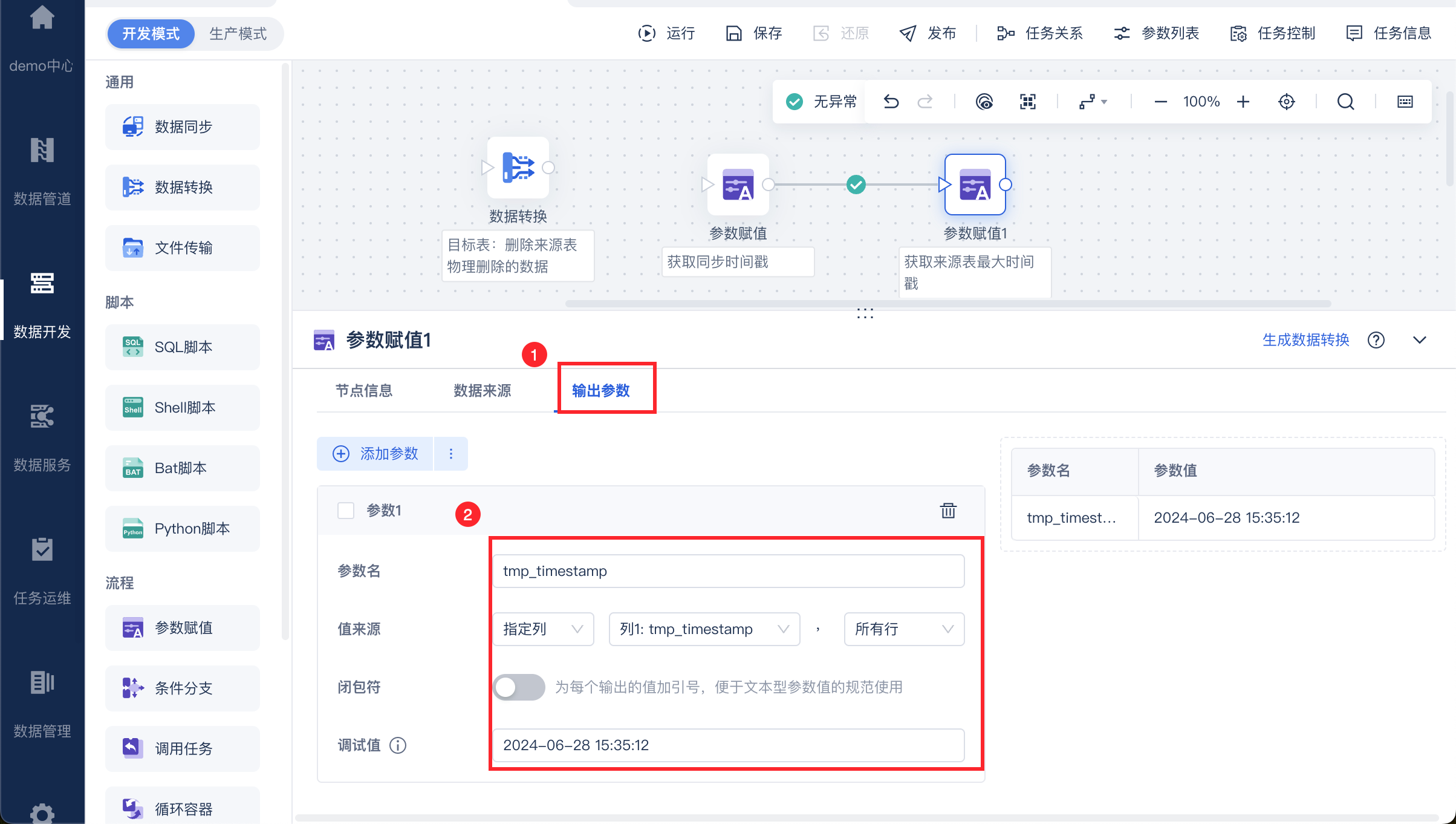使用「参数赋值」获取上次同步的时候,来源表的最大时间戳,如下图所示:
