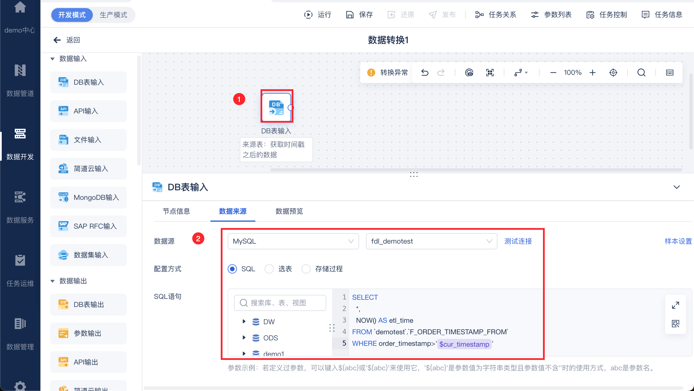 新增数据转换节点,进入编辑界面,使用DB输入算子,取出增量数据并将当前的时间作为 etl_time,便于后续写入 2.1 节的记录数据表,如下图所示:
