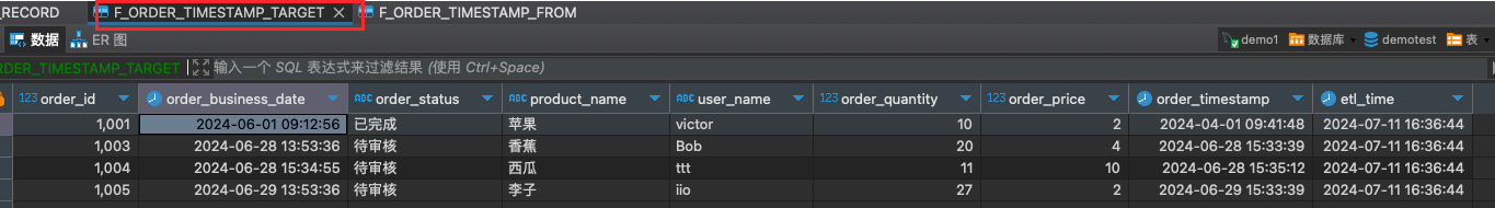 保存并运行任务后,即可在数据库中看到增删改数据同步到目标表,如下图所示: