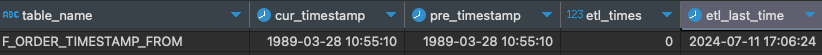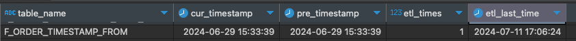 为了便于下一次使执行任务时使用时间戳,因此需要将本次同步时的最大时间戳写入 2.1 节创建的执行记录表中,同时将上次同步记录时间写入 pre_timestamp 字段,etl执行次数写入 etl_time,如下图所示:如下图所示: