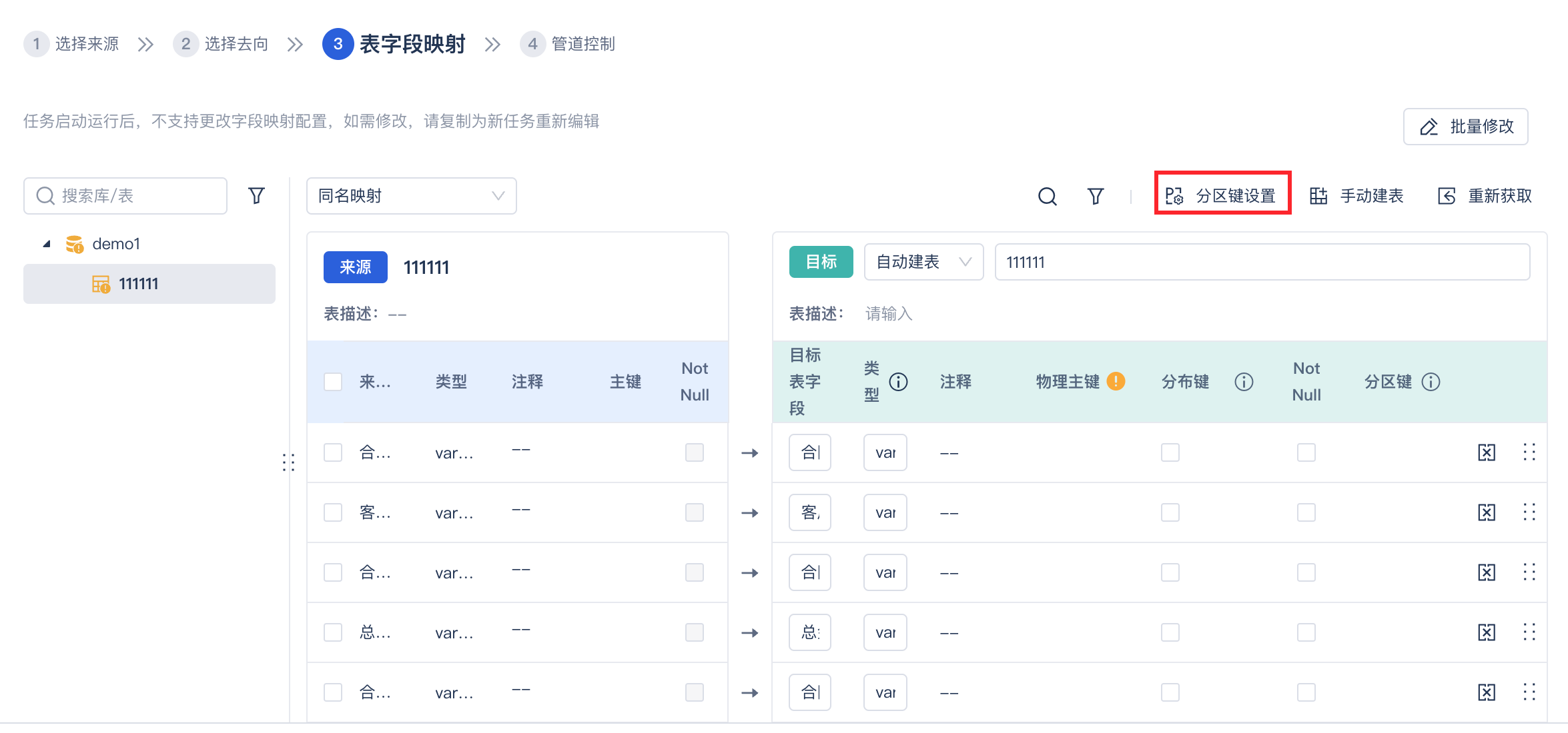 4.1.9.3 及之后的版本,管道任务自动建表支持指定分区和分布逻辑,如下图所示:
