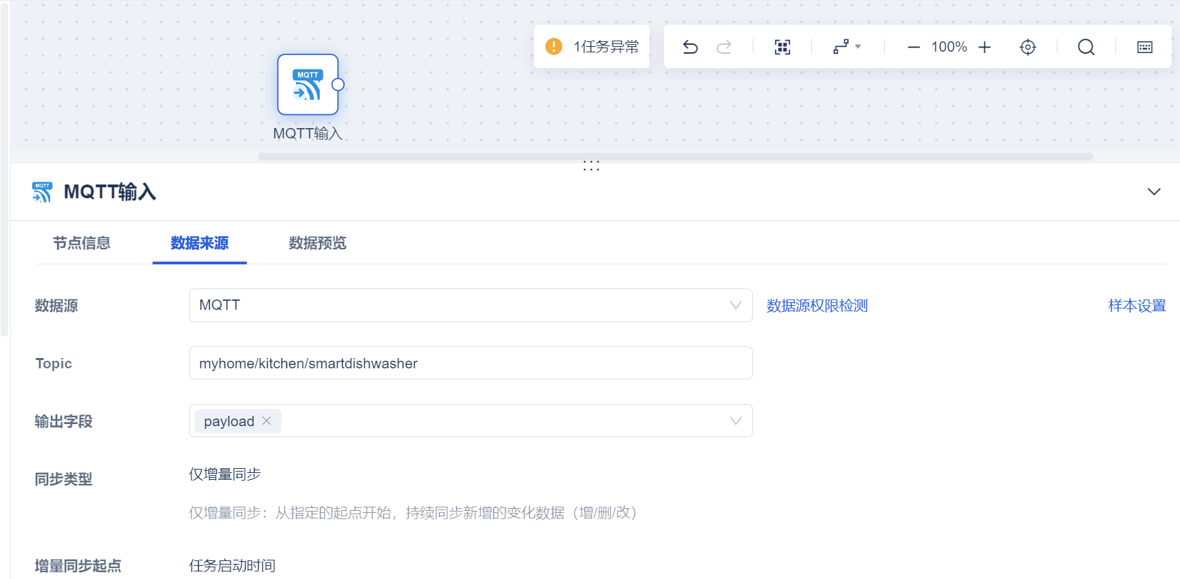 2)拖入「MQTT输入算子,选择数据源,设置 Topic 和输出字段。如下图所示: