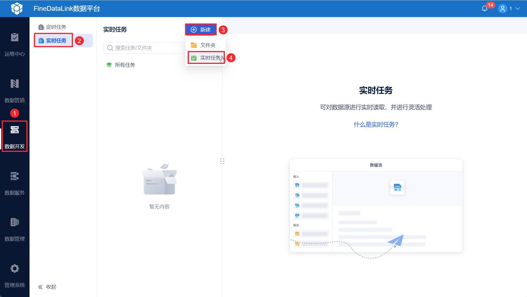 注:数据开发中实时任务当前属于内测阶段,如需试用或者了解详细信息,请联系技术支持(技术支持联系方式:前往「服务」,选择「在线支持」、电话「400-811-8890」)。